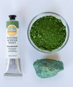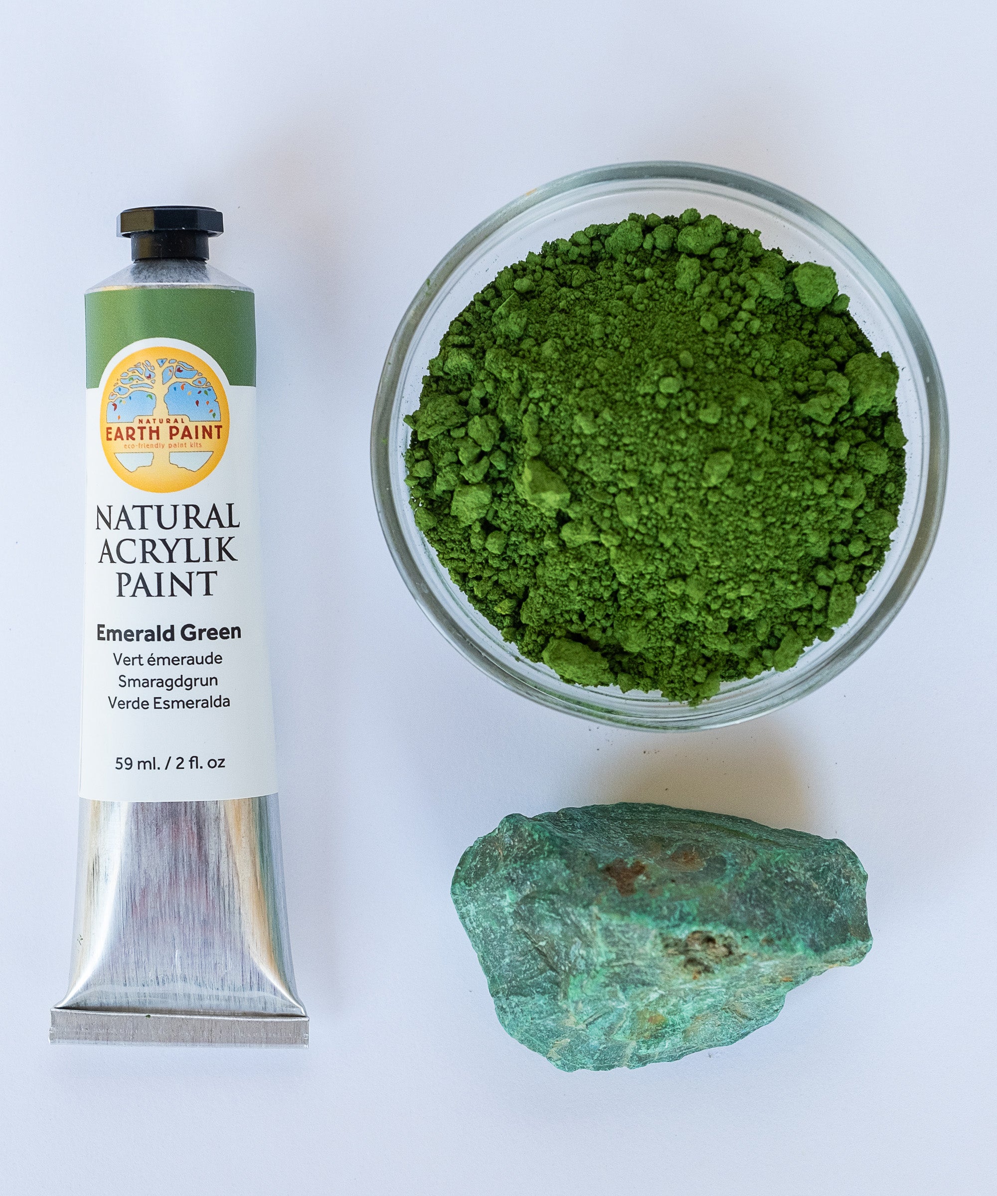 A top down view of the Natural earth paint tube in emerald green next to a bowl of matching paint pigment and a streak showing the consistency.