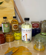Natural Earth Paint natural varnish next to the walnut oil jar and brush cleaner on a table in the garden