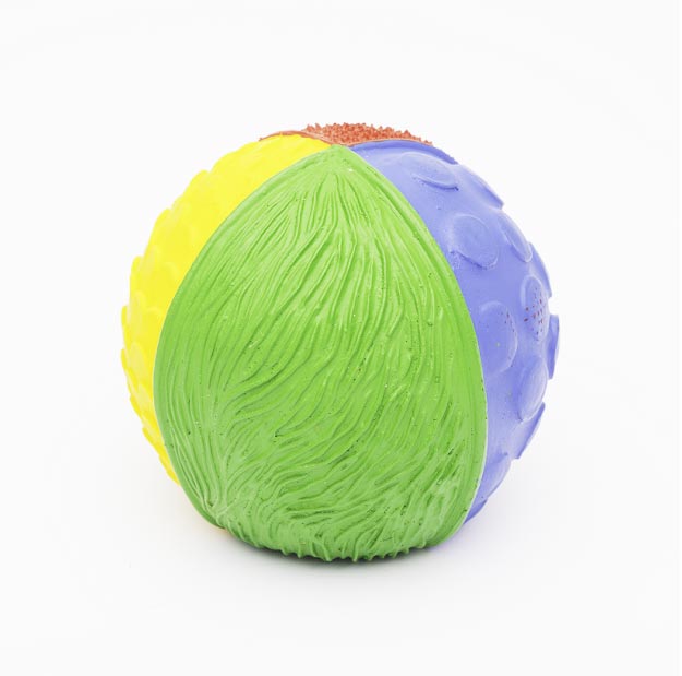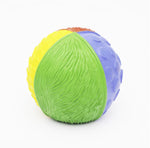 The colours on this ball are lovely and bright. The rubber is quite soft and thin, so it can be compressed quite easily. It has a cute little squeak too! I haven't given it to my baby yet, but I think he will get lots of sensory feedback from the textures, colours and sound.