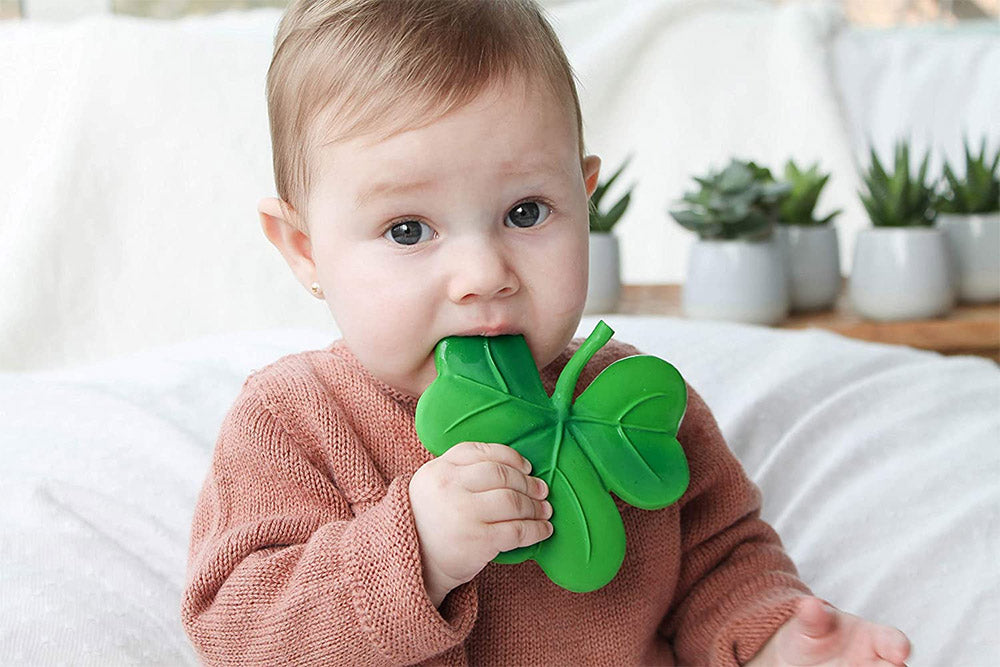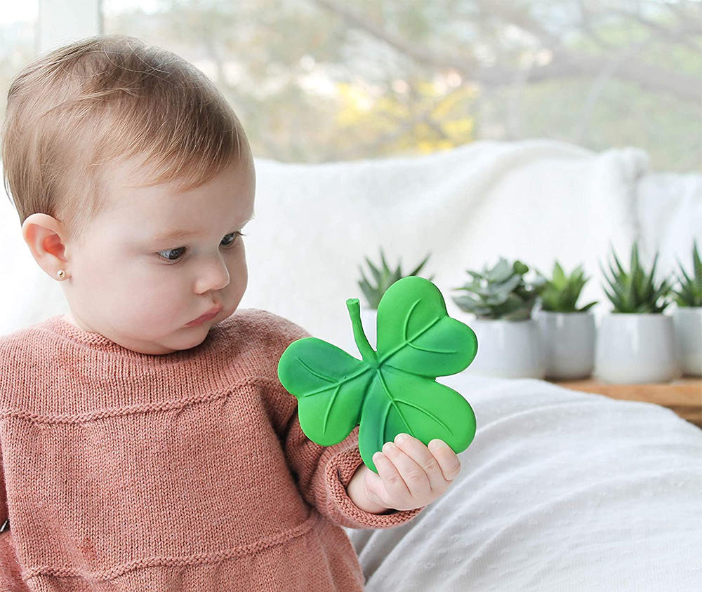 Cet anneau de dentition trèfle sûr, écologique et biodégradable est fabriqué à partir de la sève d'un hévéa et est exempt de tout élément nocif. Lanco peint à la main les veines et les nuances du trèfle avec des colorants de qualité alimentaire, ce qui rend cet anneau de dentition sans danger pour la bouche et les mains des jeunes.