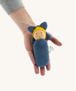 Nanchen Flower Rattle Doll - Forget-Me-Not, is a soft, organic and handmade sensory doll toy with a blue body, a little blue hat with blue forget-me-not leaves and a yellow strip of fabric to mimic hair. This doll also has an adorable face with blue eyes