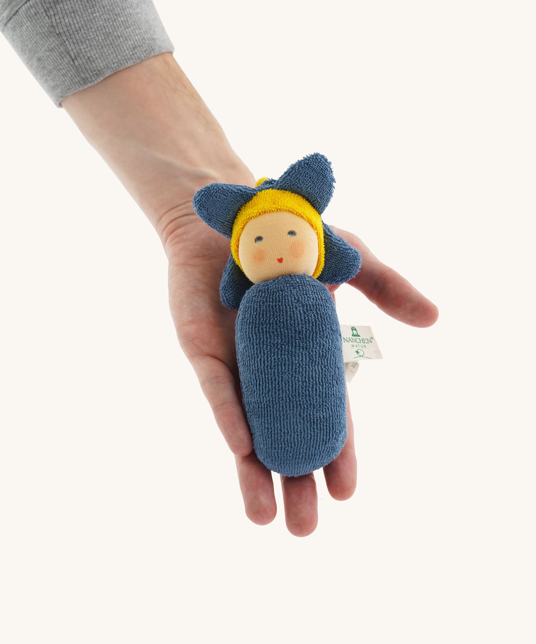 La poupée hochet Forget Me Not de Nanchen est une poupée en tissu éponge doux et biologique de la taille parfaite pour que les bébés et les tout-petits puissent la saisir et la secouer. Cette adorable petite poupée à fleurs a un corps bleu et porte un chapeau à fleurs myosotis bleu avec un joli visage peint à la main, ce qui garantit qu'aucune poupée n'est identique. Les fibres naturelles retiennent les odeurs familières et la chaleur corporelle, ce qui en fait un ami réconfortant pour les câlins au coucher. Doux, sensoriel et sans danger pour les bébés à explorer avec de petites mains et bouches, ce hochet de poupée est un cadeau parfait pour un nouveau-né. L'engagement de Nanchen envers l'artisanat, la production éthique et les matériaux biologiques de haute qualité font des jouets Nanchen Waldorf un cadeau spécial qui sera chéri toute une vie.