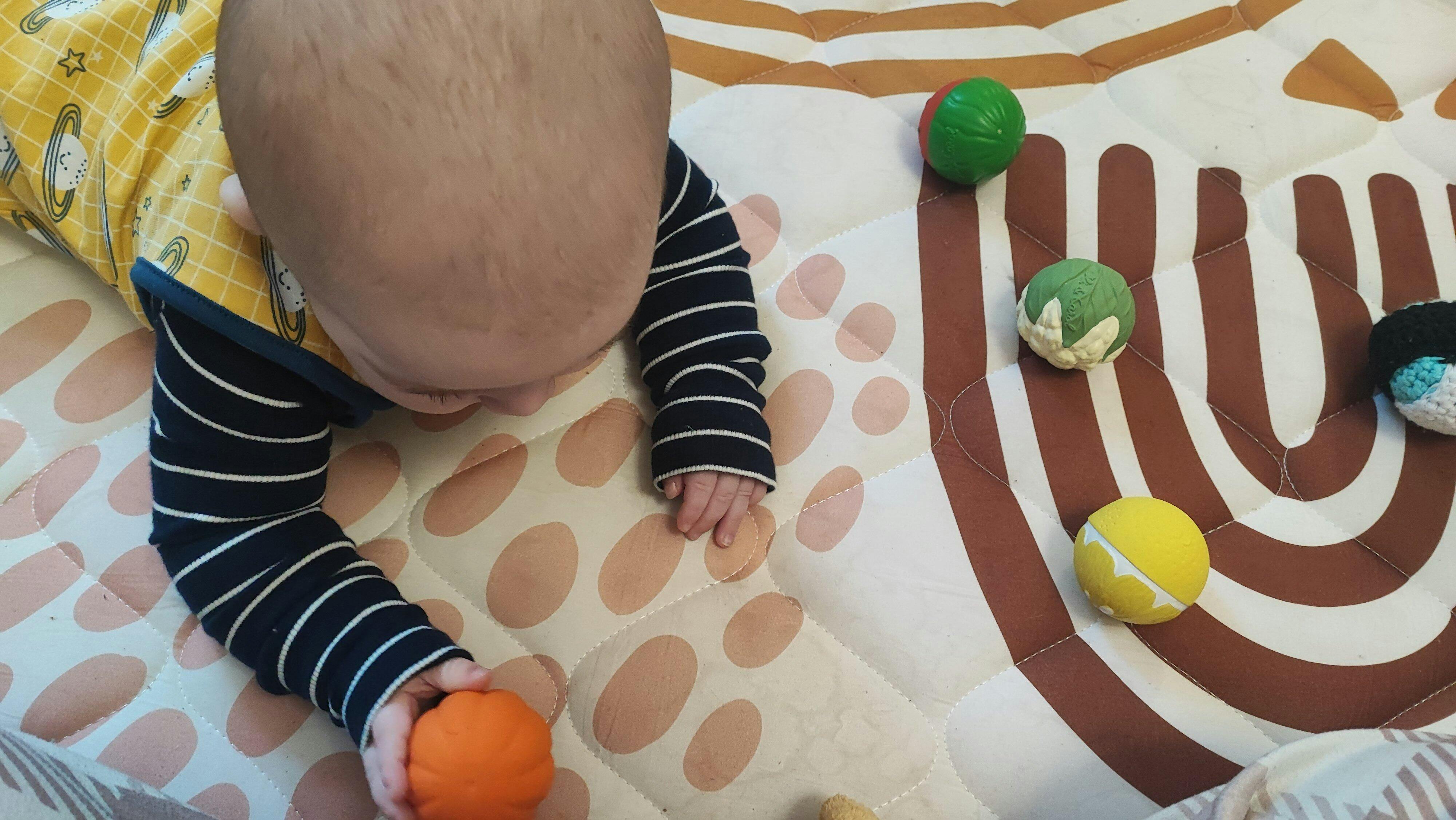 A baby laying on their front surrounded by Oli& Carol baby sensory balls