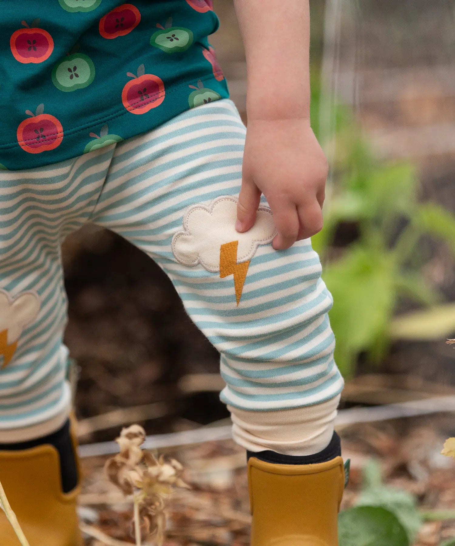 Close up of the Little Green Radicals weather knee patch blue and cream striped organic cotton joggers worn with a green apple print t-short and yellow wellington boots. The applique knee details features a white cloud and yellow lightning strike.