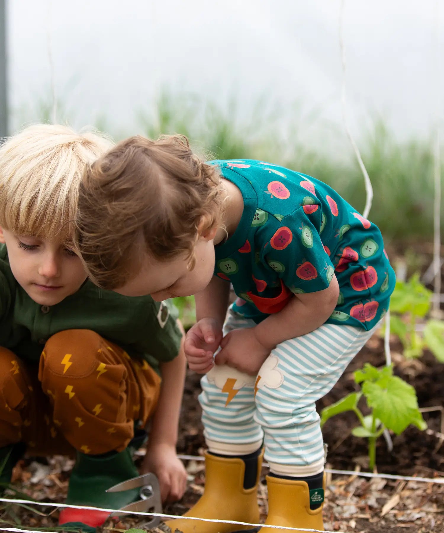 Close up of the Little Green Radicals weather knee patch blue and cream striped organic cotton joggers worn with a green apple print t-short and yellow wellington boots.