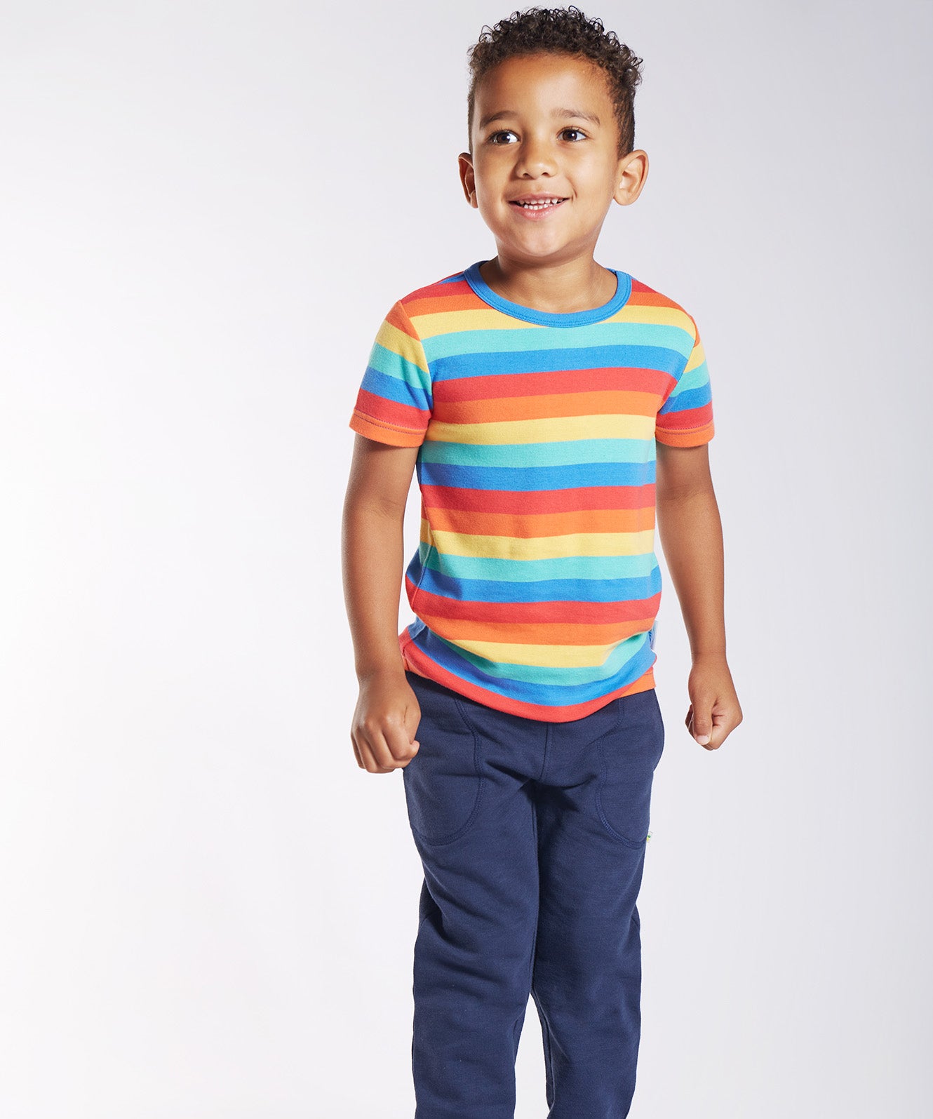 Ce t-shirt Frugi Rainbow Stripe Favorite est un haut à manches courtes en coton biologique pour bébés et enfants avec de larges rayures arc-en-ciel et un col bleu extensible. Des incontournables du quotidien à coordonner avec des basiques colorés ou des imprimés de la gamme Frugi. Ce haut Frugi s'agence parfaitement avec des bas confortables, des salopettes, des jeans et des shorts de Babipur. Fabriqué de manière éthique avec du coton biologique doux et équitable, ce haut Frugi est doux pour les peaux délicates et respectueux de l'eczéma.