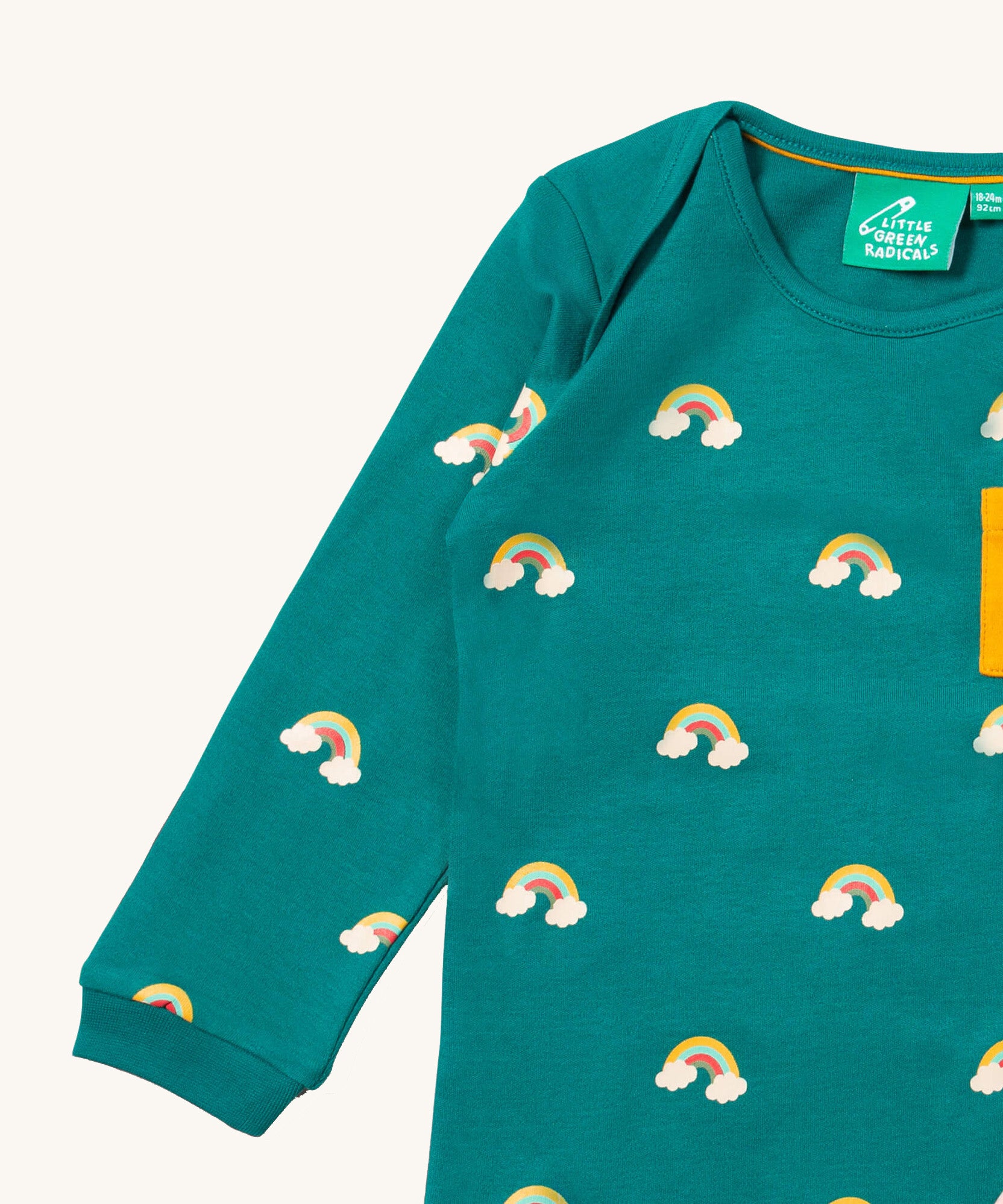 Little Green Radicals turquoise rainbow t-shirt. A GOTS organic cotton top with long sleeves in turquoise with prints of rainbows on clouds and a yellow chest pocket.