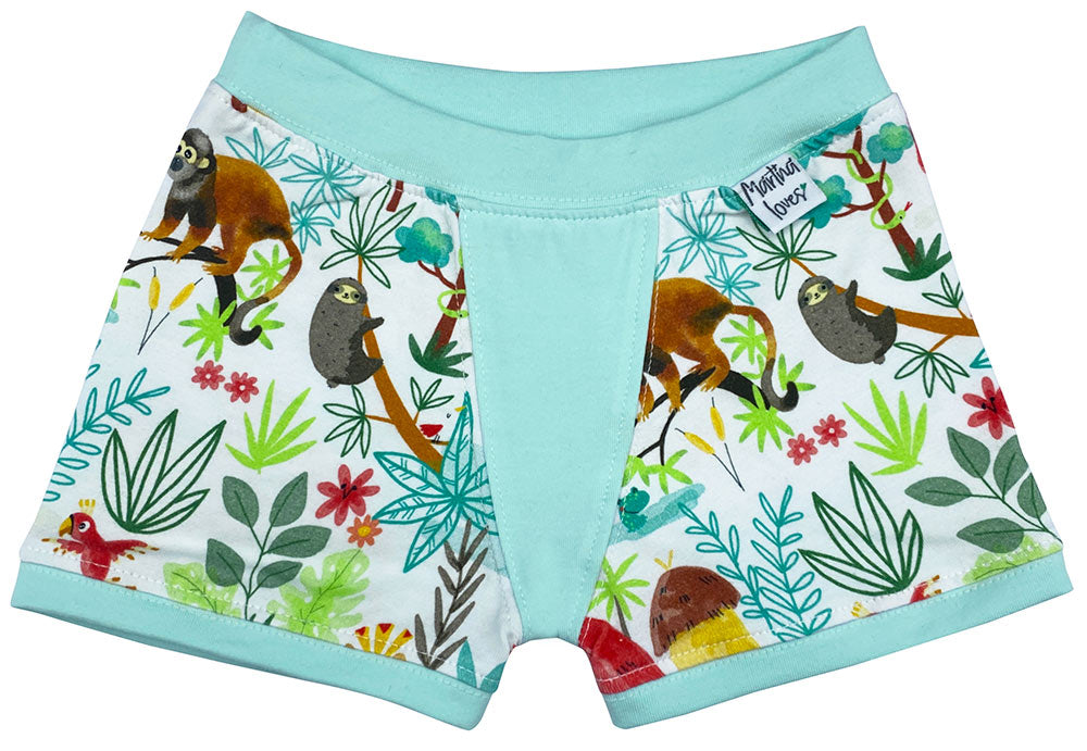 Ces boxers en jersey de coton biologique Jungle Boogie faits à la main pour les tout-petits et les grands enfants sont fabriqués avec amour et ont un adorable design original et vibrant de paresseux, de palmiers et de scènes de la jungle avec une ceinture et une bordure de jambe extensibles super confortables.