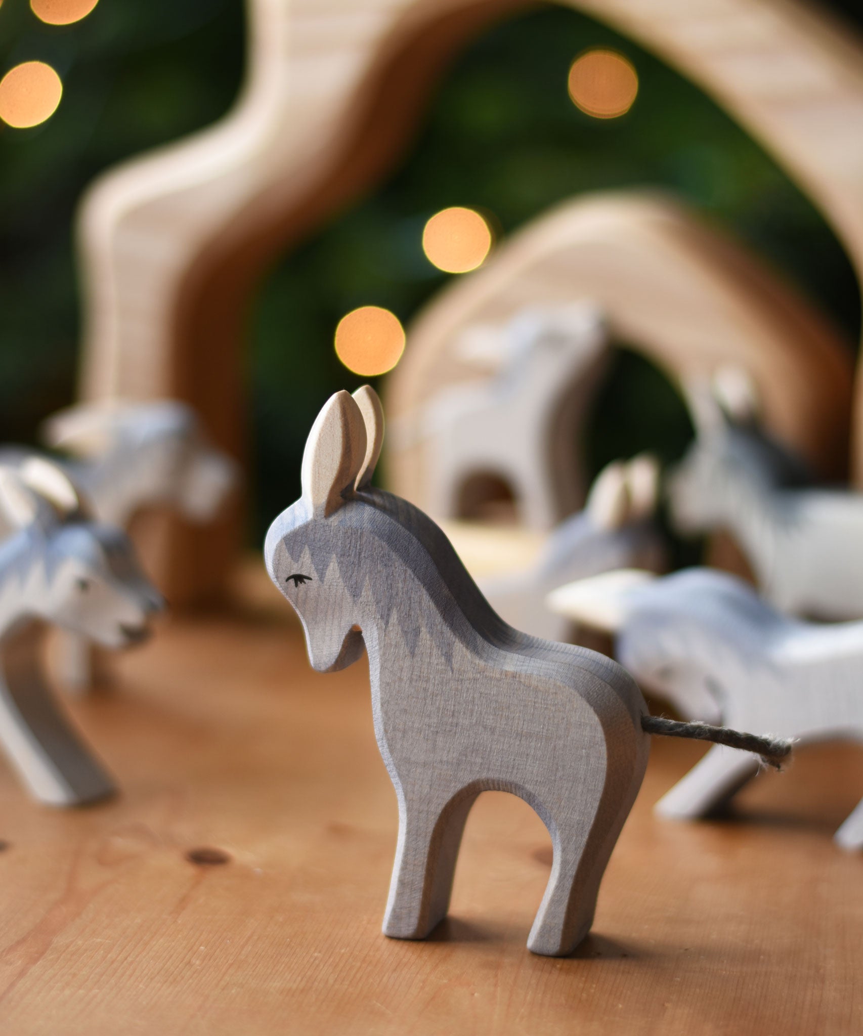An Ostheimer standing donkey wooden toy figure placed on a wooden surface, other donkey's can be seen in teh background. Ostheimer's range of hand crafted, heirloom quality wooden toys are available to buy at Babipur.