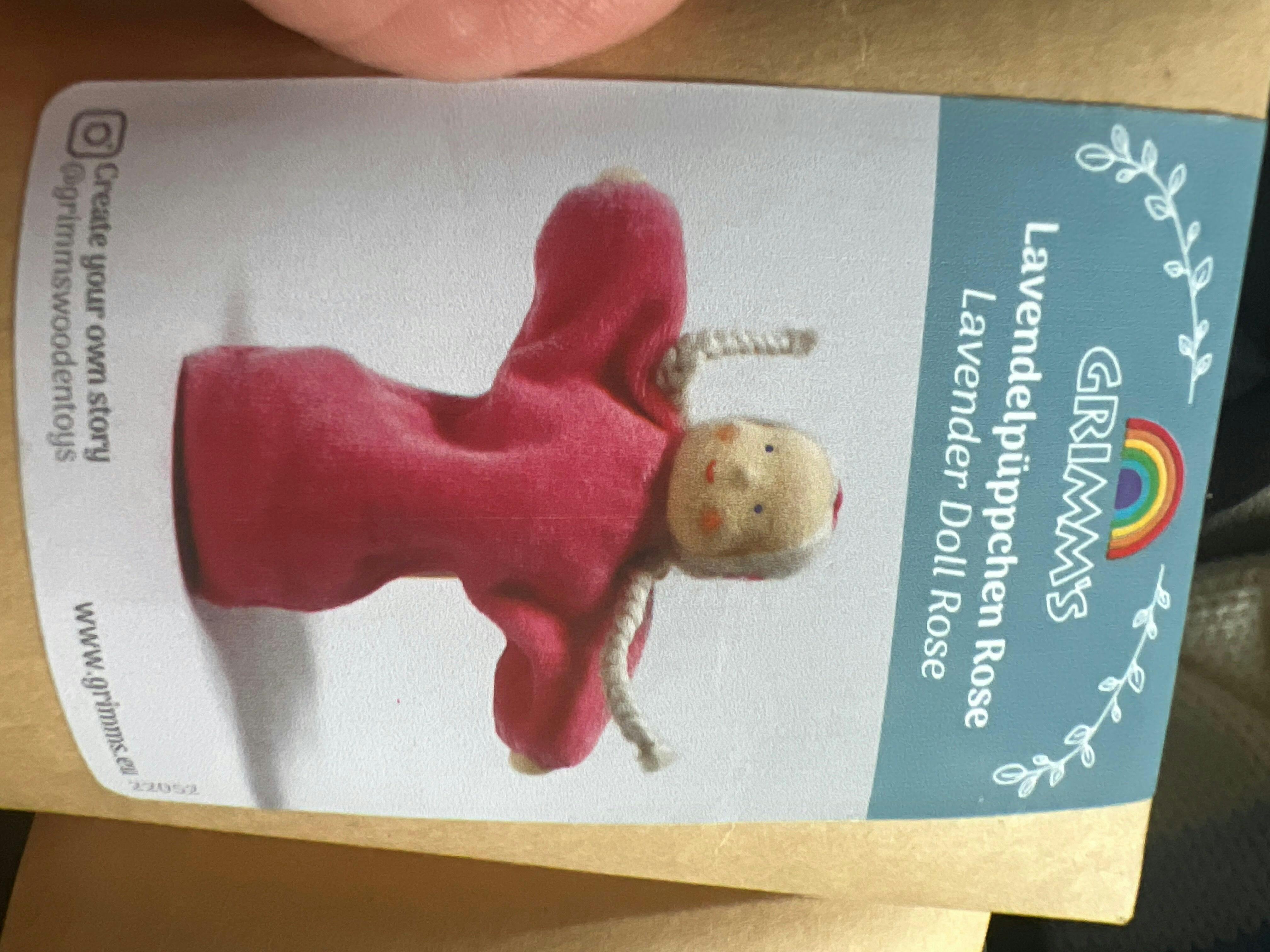 The Grimm's Lavender Dolls stood next to each other, with pieces of the Grimm's small natural rainbow and a sprig of lavender