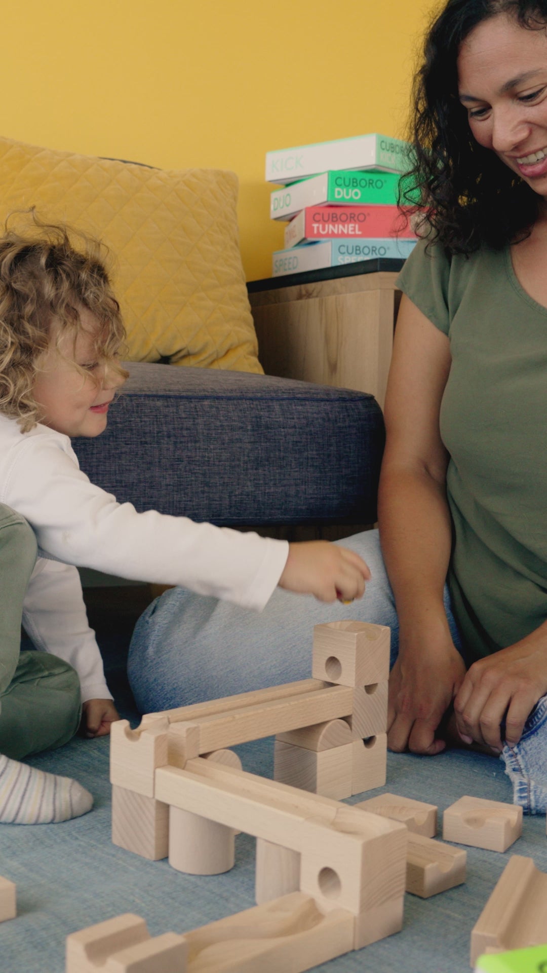 Child and adult sat on a wooden floor playing with the Cuboro handmade wooden marble run toy blocks