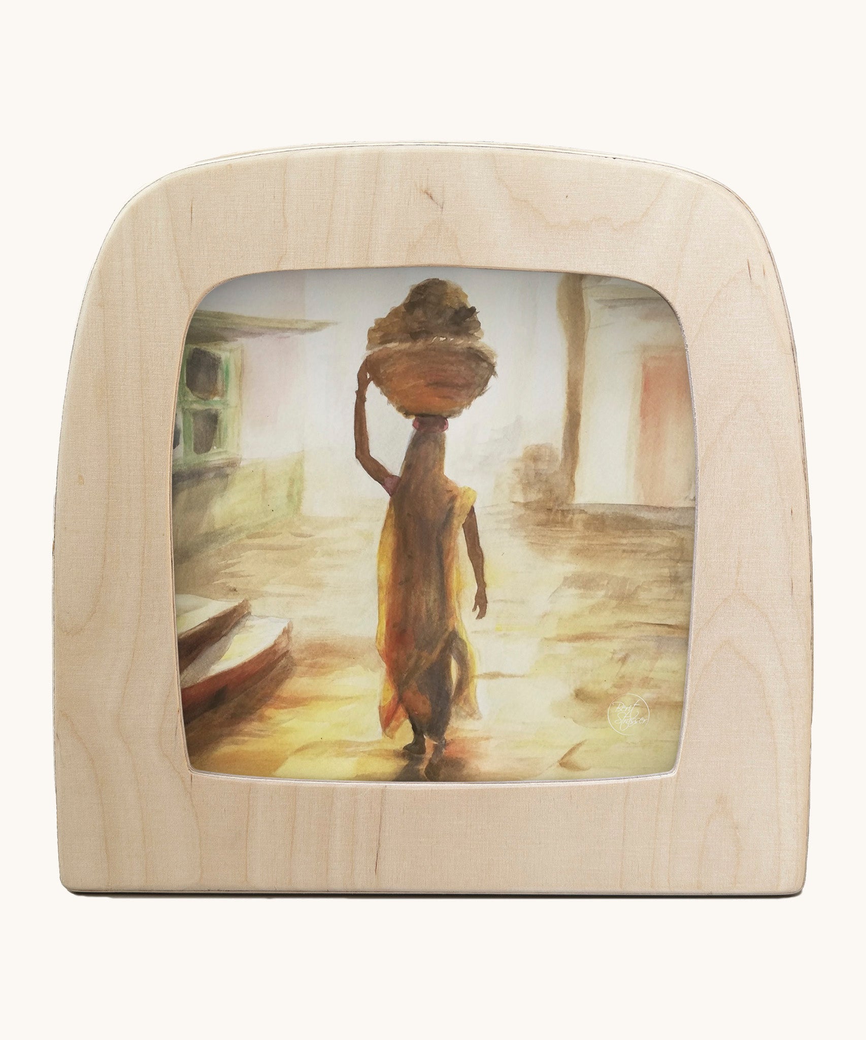 Toverlux morning light silhouette by Berit Strasser a oil pastel style of a woman holding a basket on her head. Shows silhouette in a wooden frame