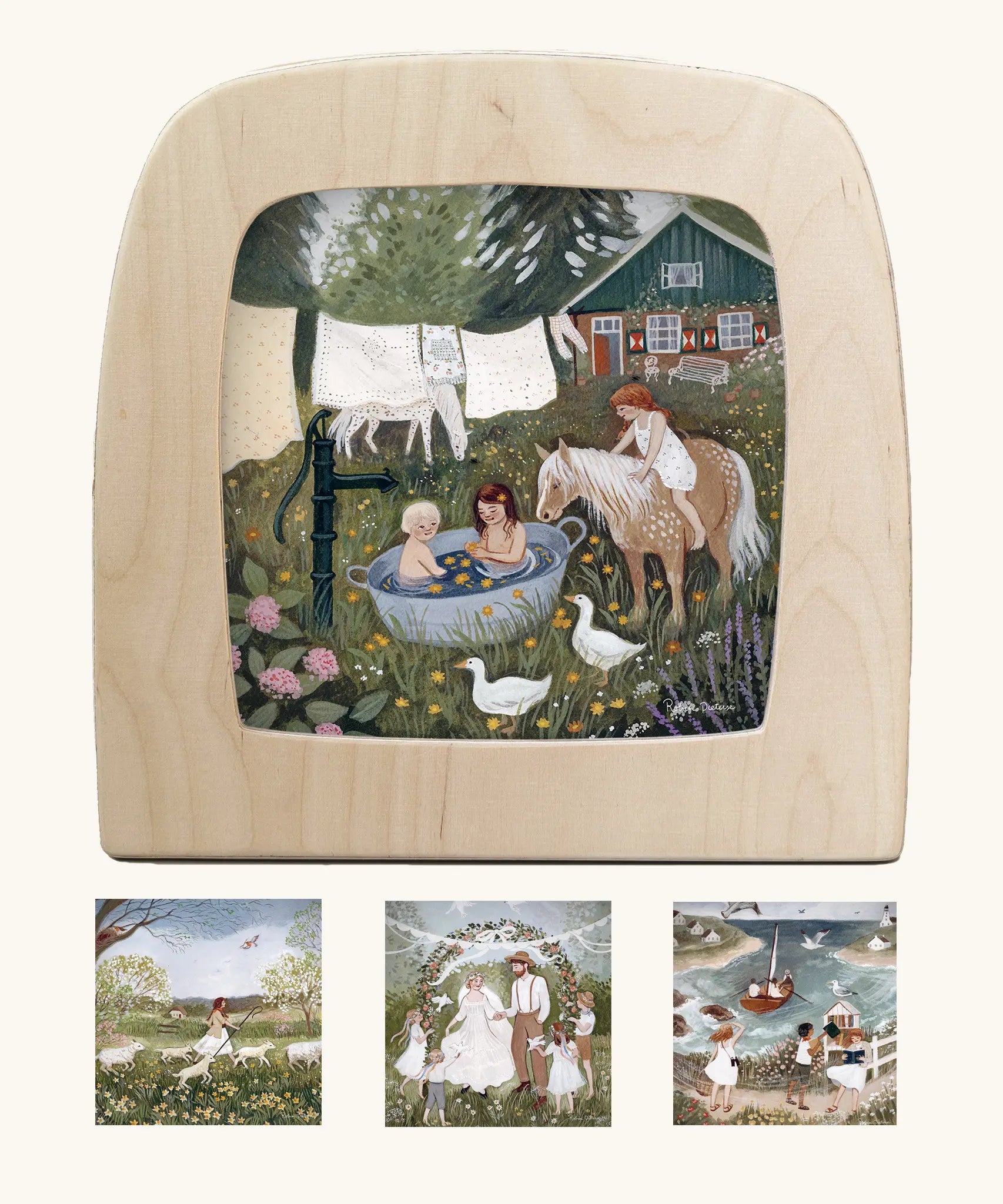 Orchard morning Toverlux Magic Lamp silhouette inside a wooden magic lamp. Artwork By Robin-Pieterse. A delicate painting style illustration of a woman and a child picking apples from a tree with a girl and a dog on a blanket in the background. This silhouette is available at Babipur