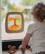 A close up of a Autumn woodland inspired Toverlux silhouette inside a 2 children looking at a silhouette inside a Toverlux Magic Window Frame available at Babipur.