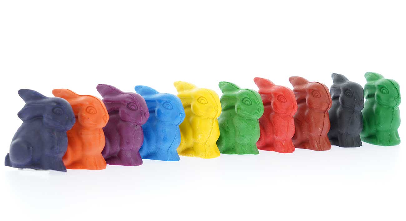 Dix lapins colorés sont disponibles. Fabriqués avec les meilleurs ingrédients naturels, dont 25 % de cire d'abeille pure, ces crayons sont non toxiques et exempts de pétrole. Ils offrent une belle profondeur de couleur aux artistes en herbe. Par temps froid, ils peuvent présenter une couche blanche en surface due à la cire d'abeille, gage de qualité qui n'altère pas la couleur.