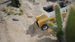 Back of the Candylab childrens wooden zebra drifter suv toy on some sand next to its spare tyre