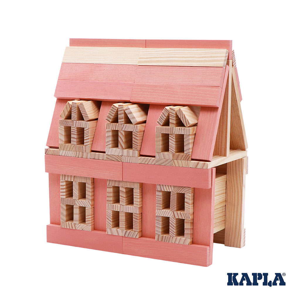 Kapla eco-friendly rose pink building blocks in their box on a white background