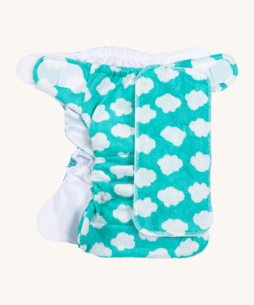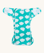Tots Bots Bamboozle Birth to Potty nappy in a green fluffy clouds print.