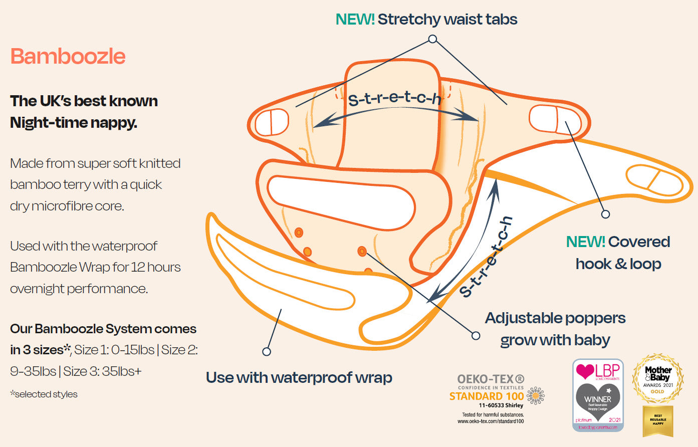 La couche Bamboozle Stretch est idéale pour la nuit et les couches très humides. Elle peut être utilisée avec les serviettes Bamboozle Day to Night pour une absorption accrue. De jour comme de nuit, la couche Bamboozle peut être portée jusqu'à 12 heures par nuit pour un sommeil paisible et sans fuites. Les couches, les serviettes et les couches extensibles sont lavables séparément, ce qui vous permet de changer rapidement et facilement de serviette lorsque vous êtes loin de chez vous.