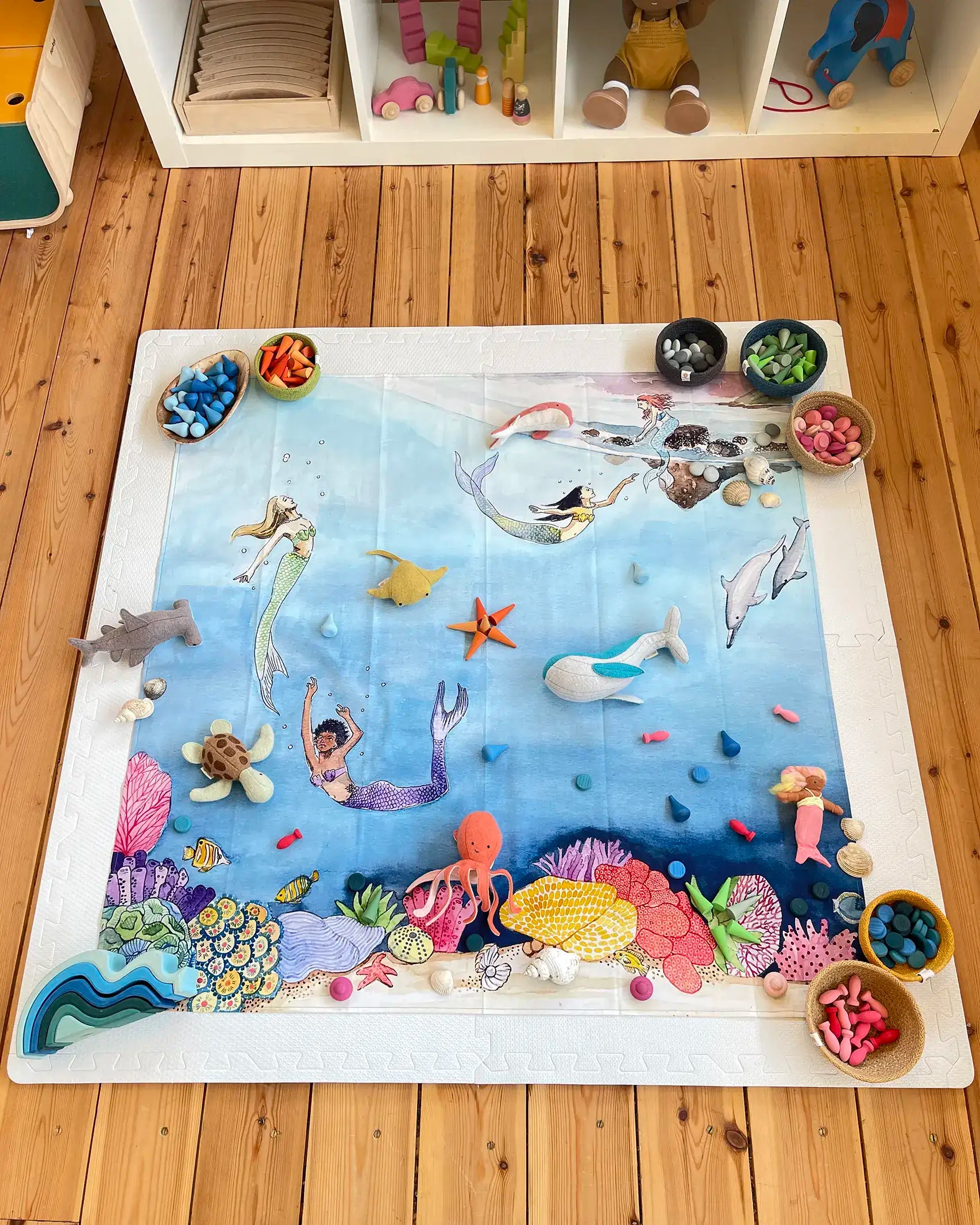 Wonderie Mermaid Play Cloth, made from organic cotton, in the Babipur playroom with Grimm's waves, Grapat mandala pieces and Olli Ella holdie sea creatures.