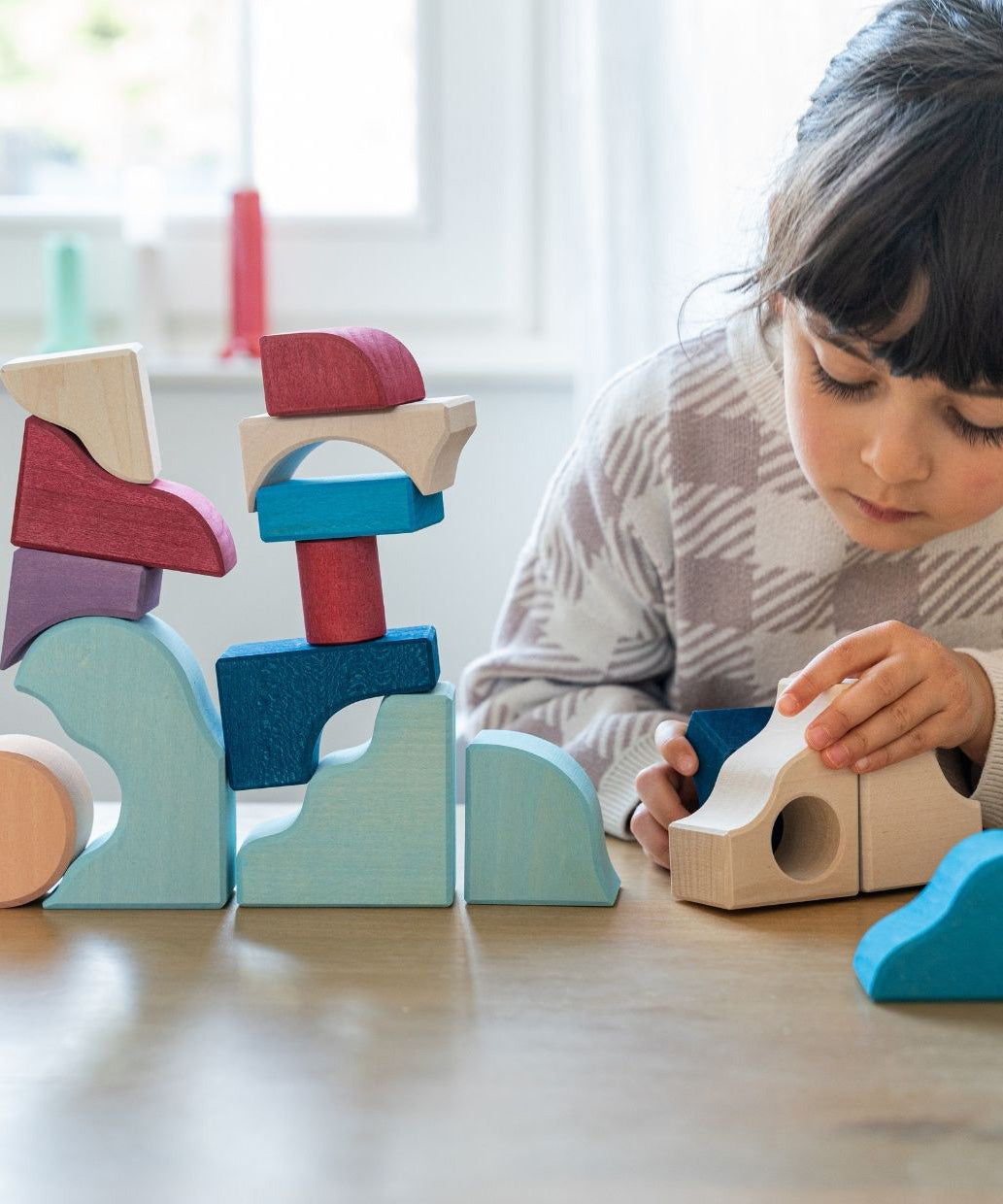 Child stacking hand carved wooden pieces from the Grimms movement set on a table