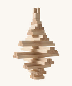 Tous ces éléments en bois sont conçus avec précision et maîtrise pour permettre un nombre illimité de configurations et de constructions empilables. À la fois jouet et œuvre d'art, cet ensemble en bois fascinant plaira aux enfants comme aux adultes, créant une œuvre d'art sculpturale, quelle que soit sa composition.