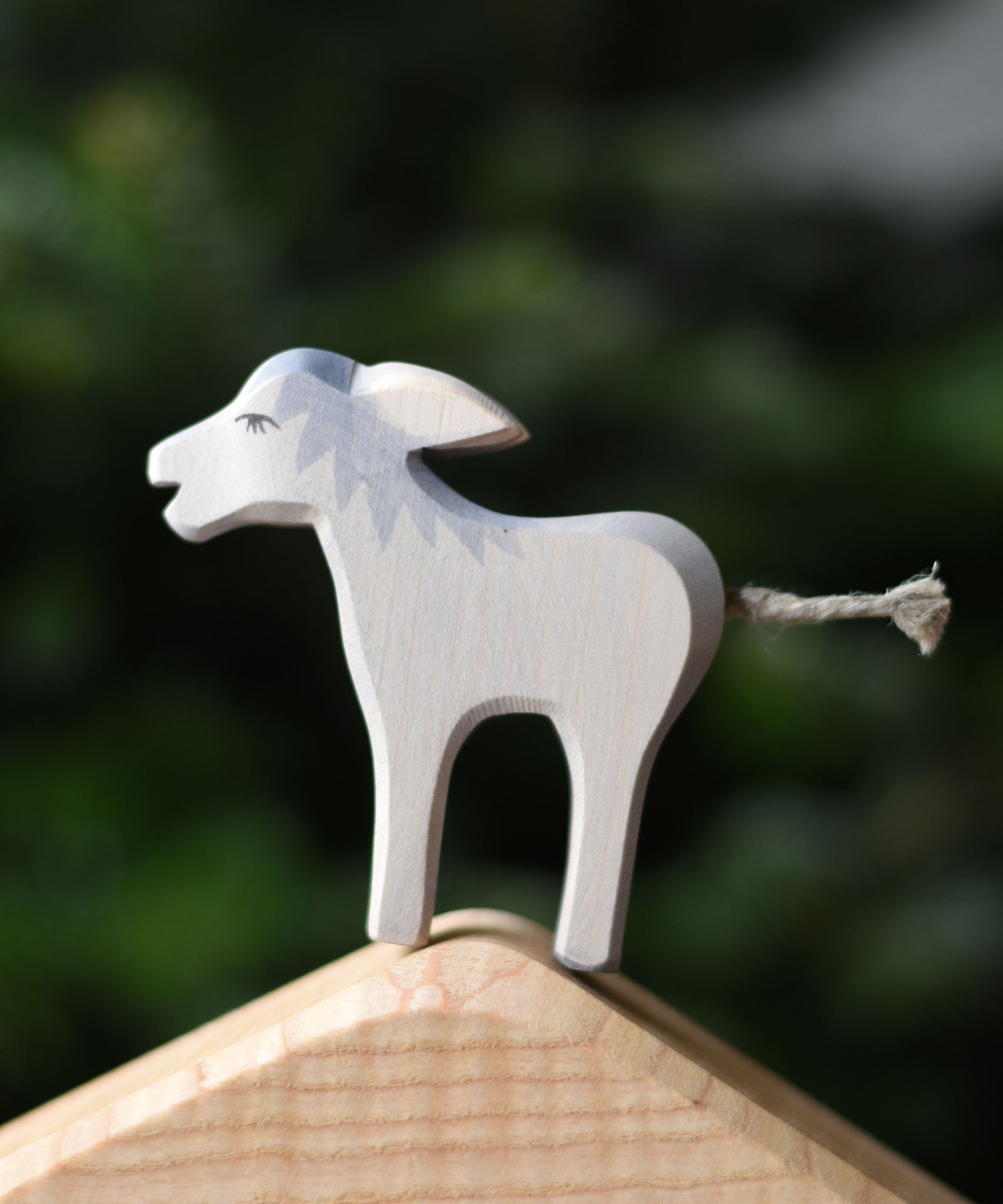 A collection of Ostheimer wooden donkeys handmade figures placed on  a wooden surface. The Ostheimer 4 piece house set can be seen in the background. Ostheimer's range of hand crafted, heirloom quality wooden toys are available to buy at Babipur.