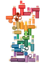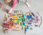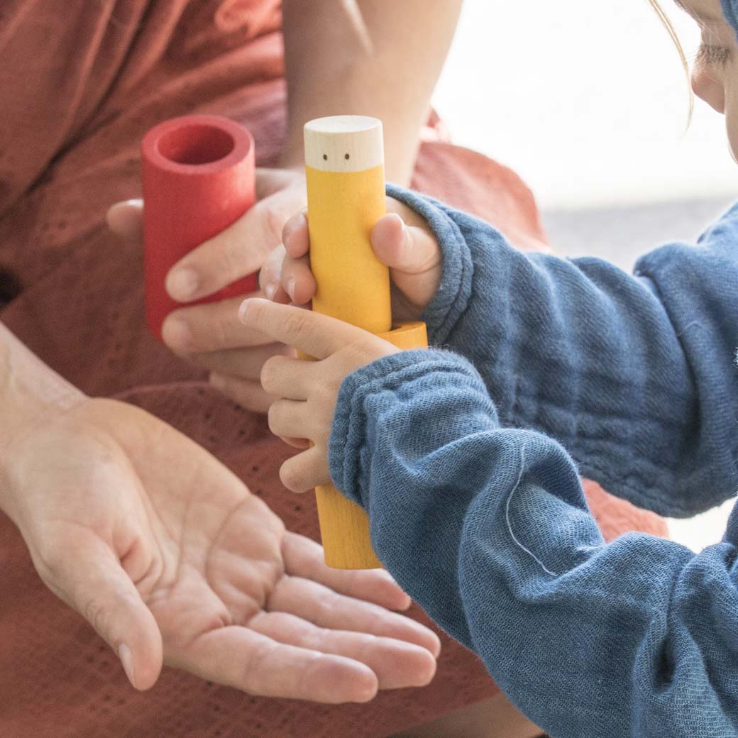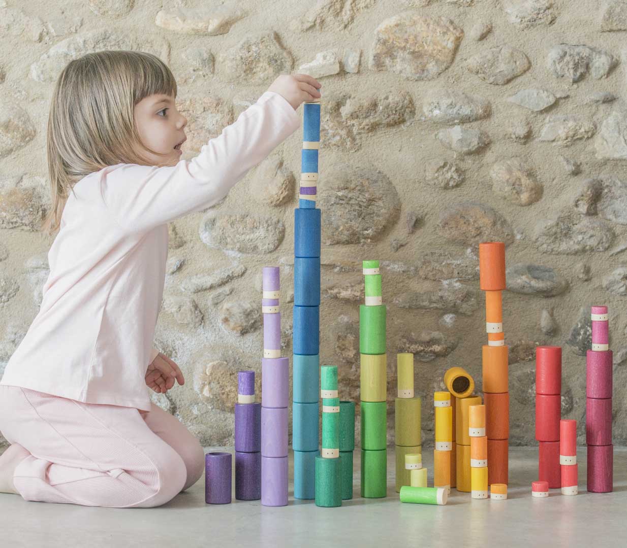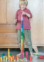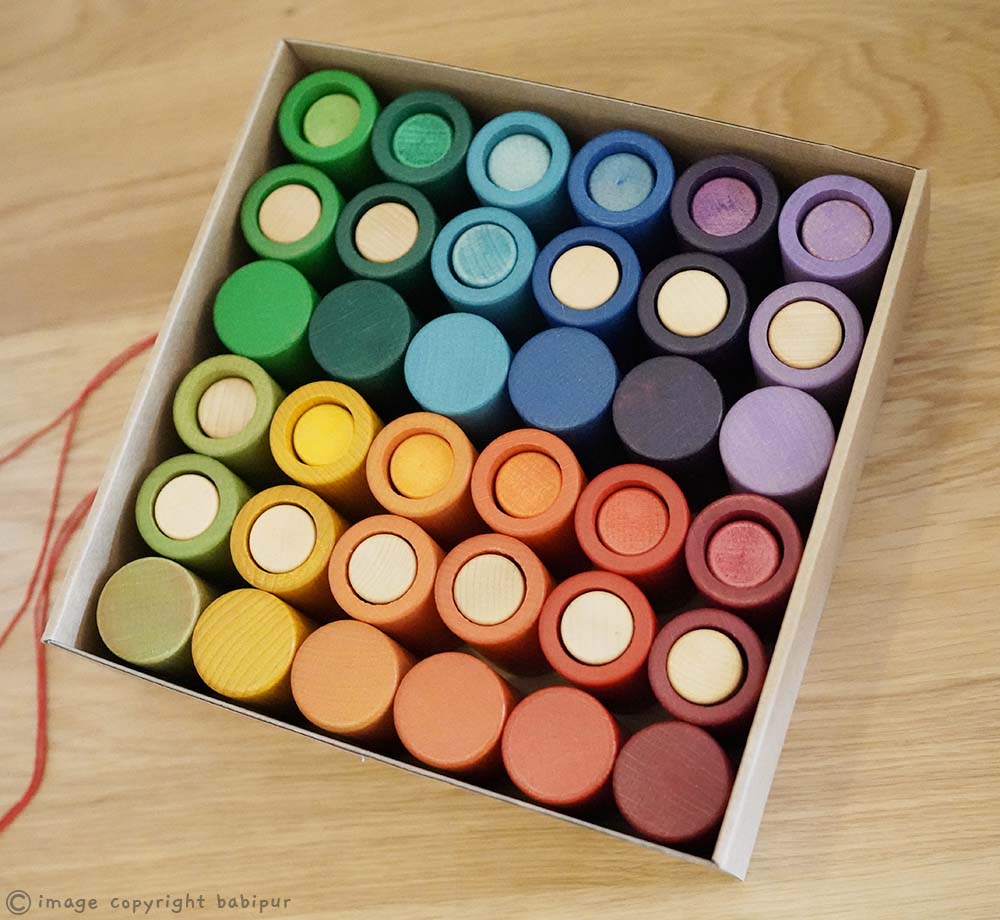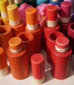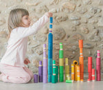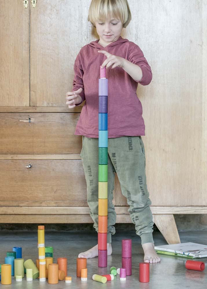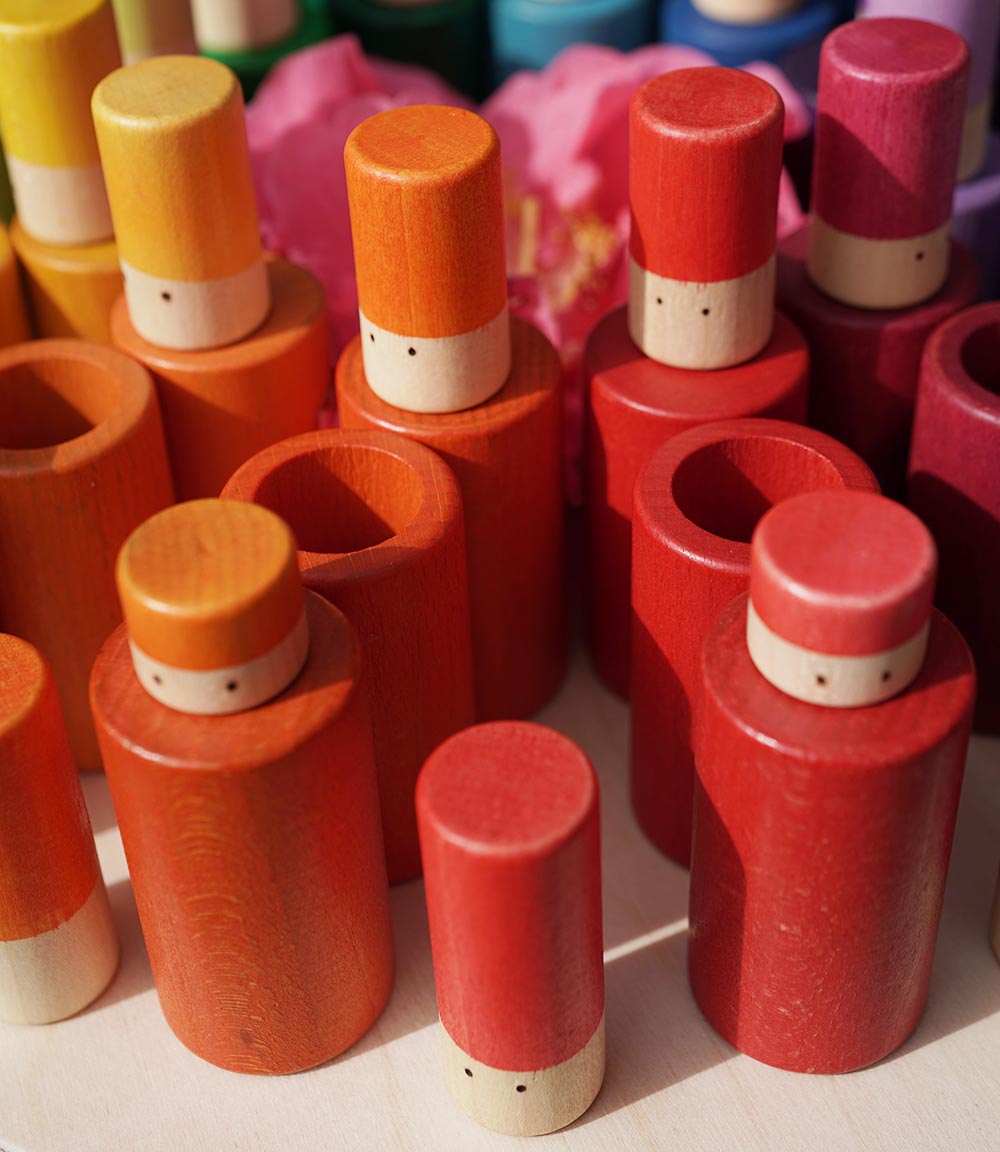 This large Grapat Lola set contains 72 wooden pieces painted in 12 different colours of the rainbow. A mixture of cylindrical playing parts, little characters (lola) with eyes in various heights, tubes, solid cylinders and half tubes. The Lola pieces slot inside the colourful tubes and half tubes.
