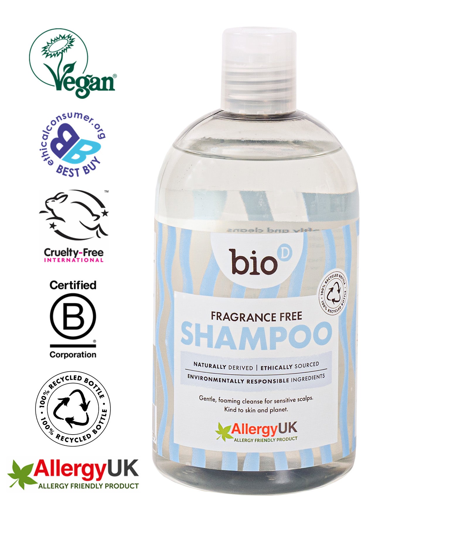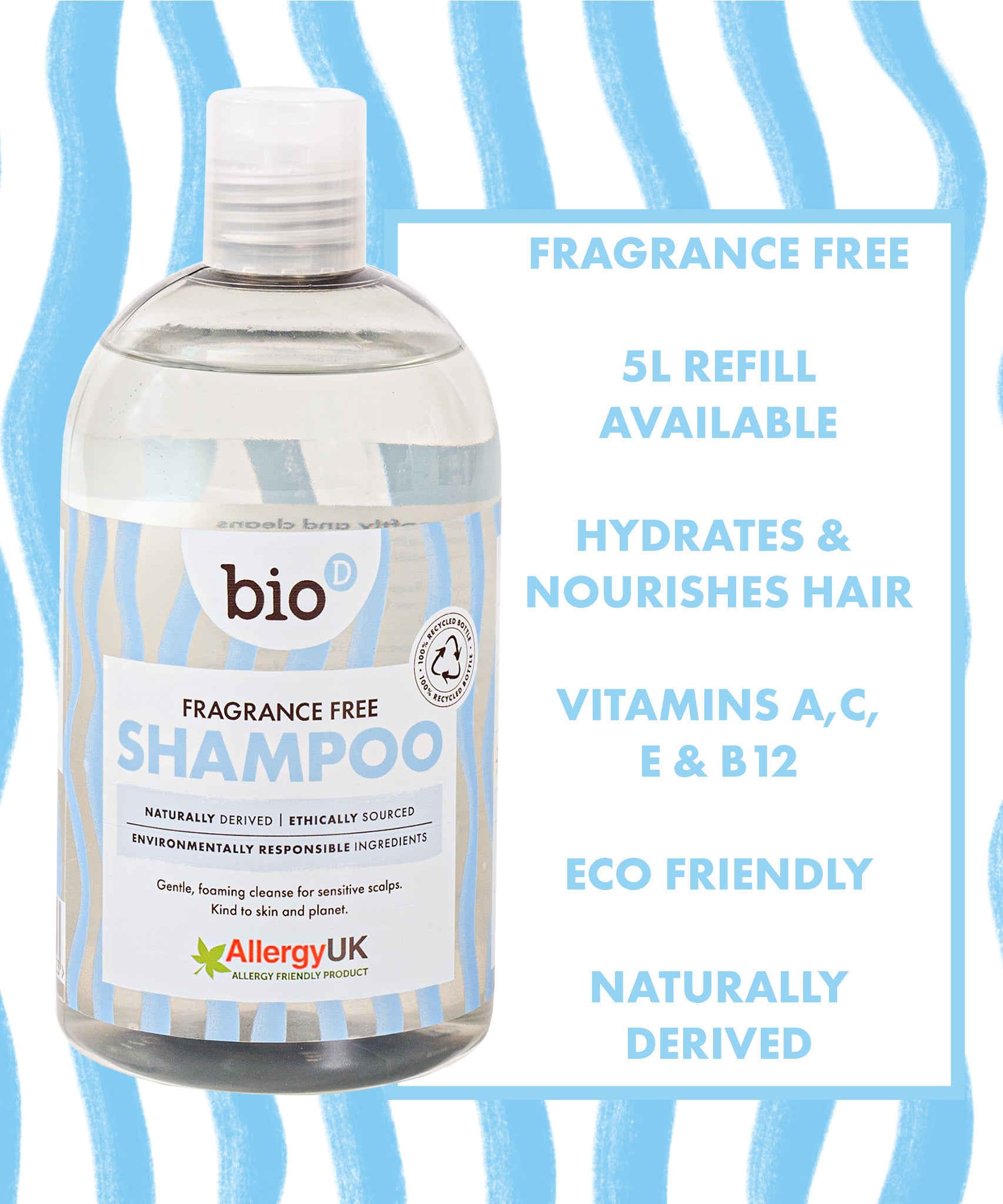 Front view of Bio-D Fragrance-Free Shampoo in a clear 500ml bottle, showing blue wave label design and Allergy UK approved logo.