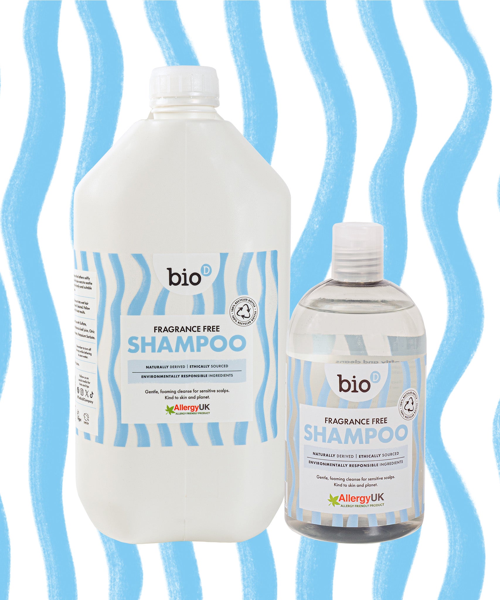 Bio-D fragrance-free shampoo, conditioner, body wash and bubble bath bottles shown together against a blue tiled background, presenting Allergy UK approved, refillable body care for sensitive and allergy-prone skin.