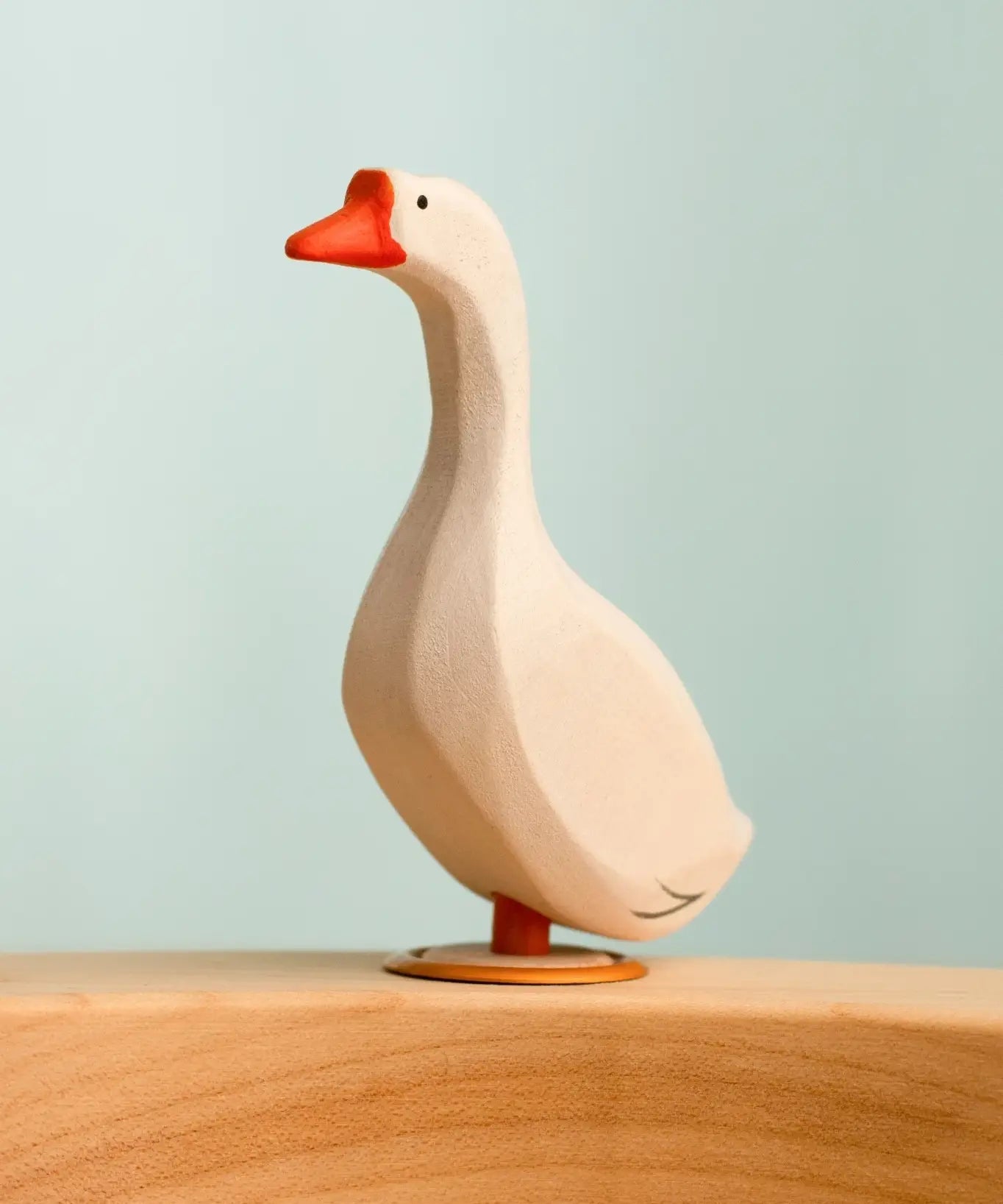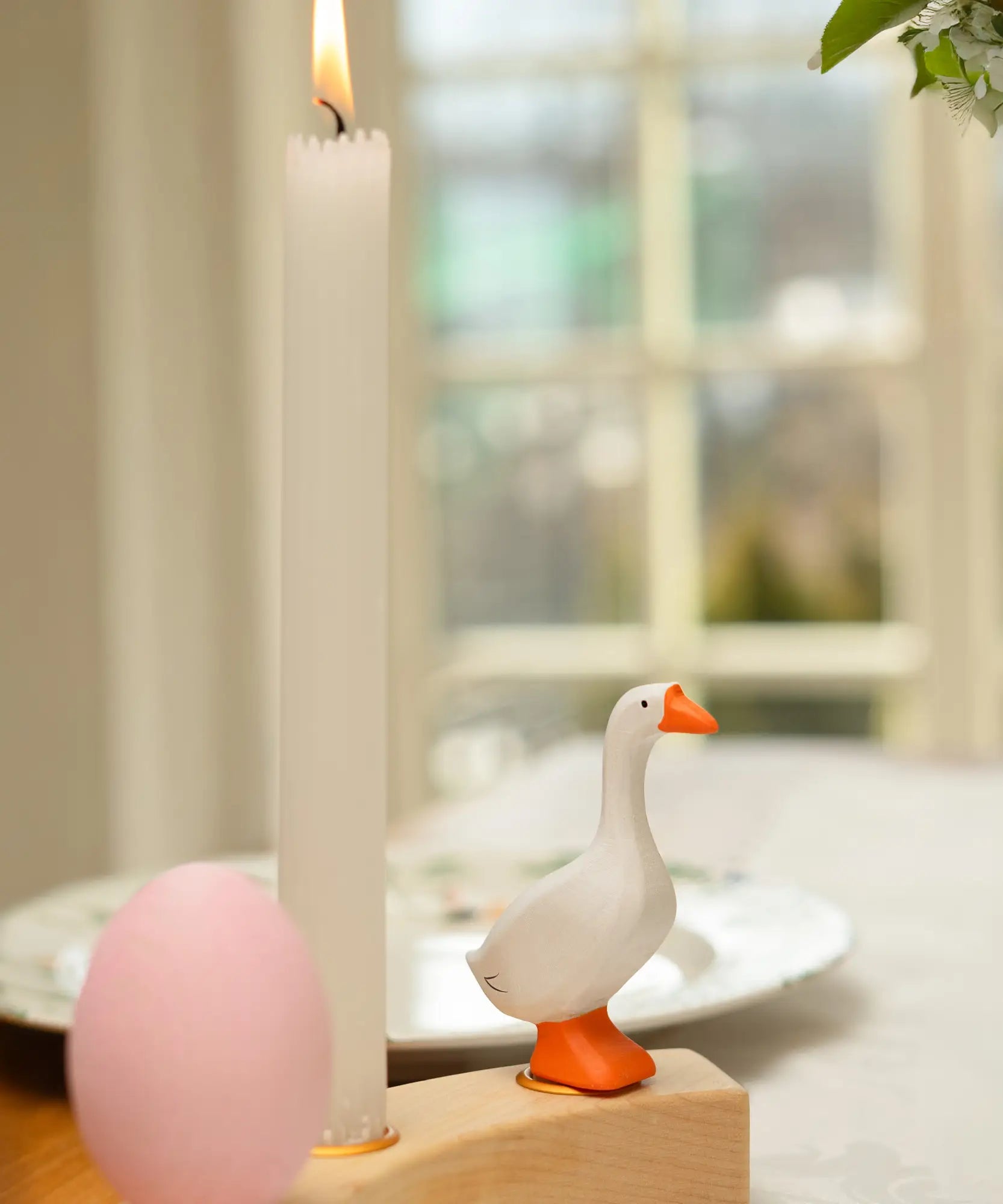 Bumbu handcrafted wooden white festive goose figure standing on wooden base for Grimms celebration ring