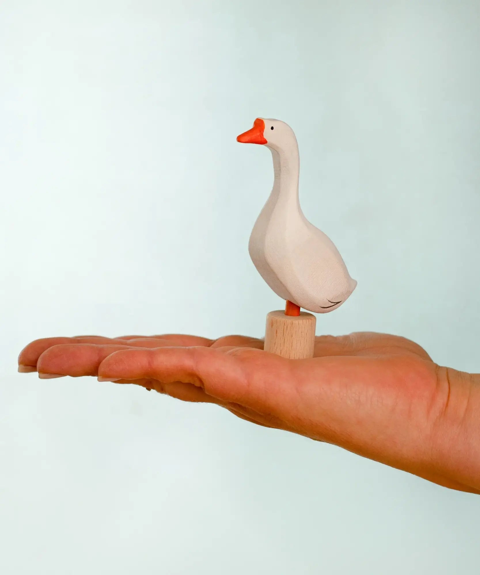The removable natural wood base peg (17mm diameter) fits perfectly into Grimm’s celebration rings and spirals. The peg can also be removed, allowing the goose to be used on its own as a toy for small world play, where it can wander through farmyards, ponds or spring landscapes in imaginative storytelling.