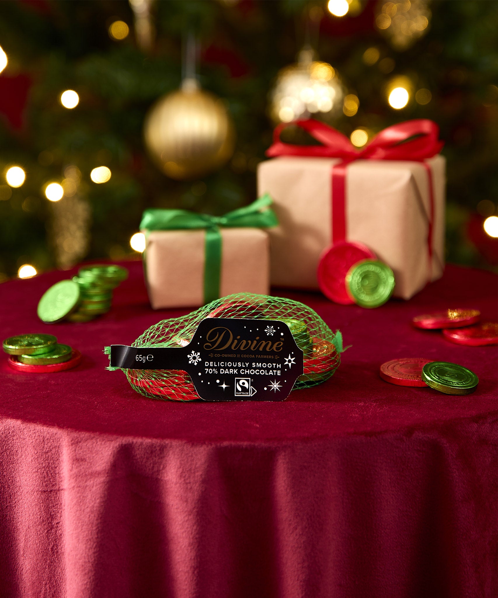 Divine fairtrade milk chocolate inside the green netted bag with various festive decorations in a background. Chocolate coins available at Babipur