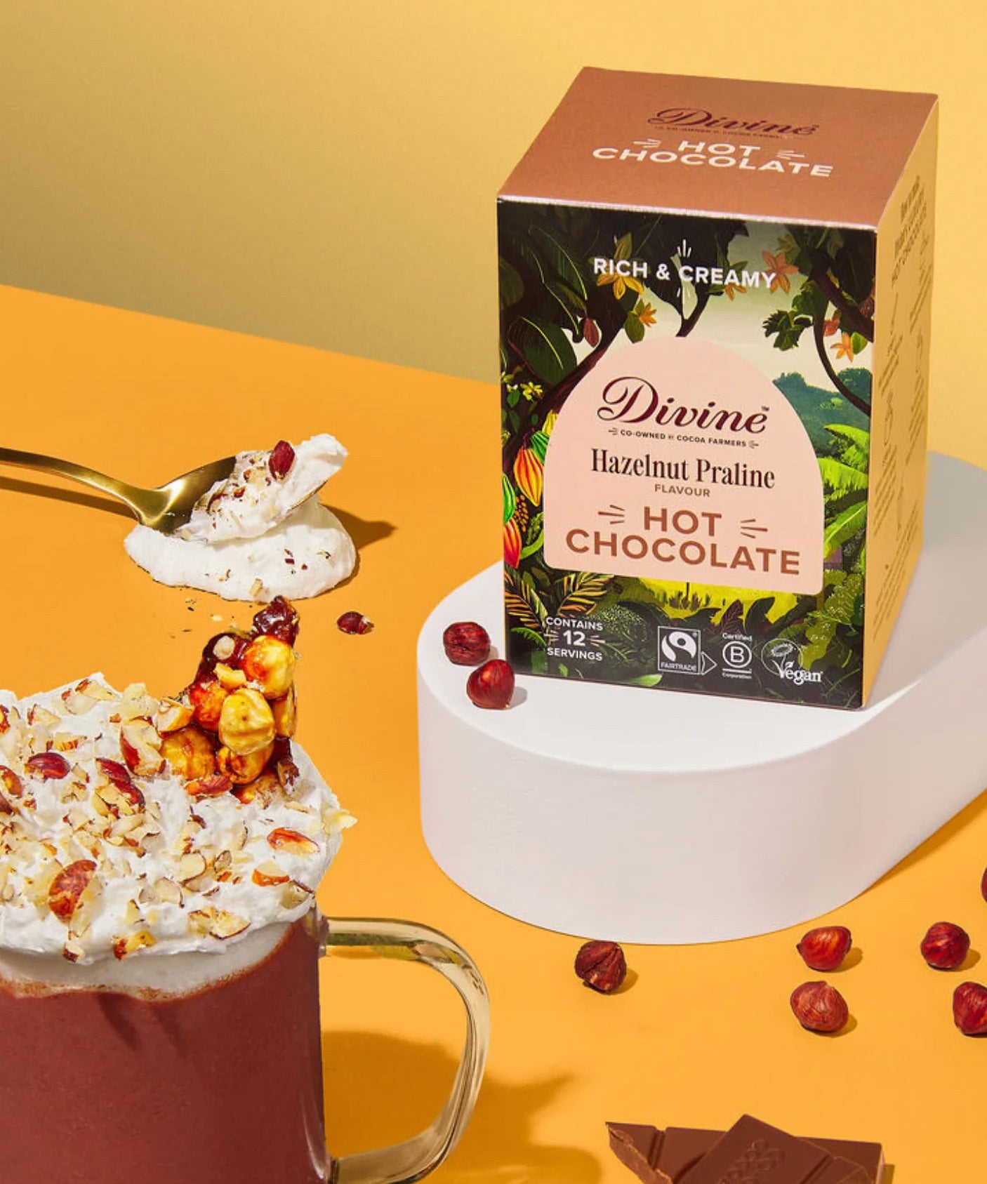 Divine keep things simple and flavour-focused with their hot chocolate mixes, using natural ingredients and high cocoa content for that authentic chocolate hit. Made without palm oil, soy, or milk powders, this Hazelnut Praline hot chocolate has a bold, rich flavour that brings luxury to your mug, plus it's vegan!
