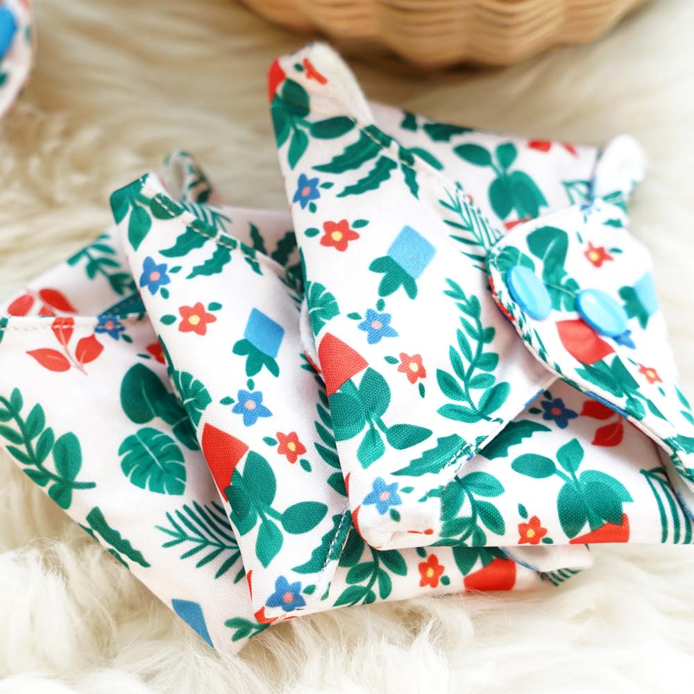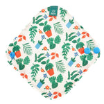 An exciting collaboration between Babipur and Fern Period Products, this exclusive Planty Babipurian Light reusable menstrual pad is covered in lush green houseplants in red and blue pots on a pale pink background. Perfect for the houseplant obsessed foliage fanatic!