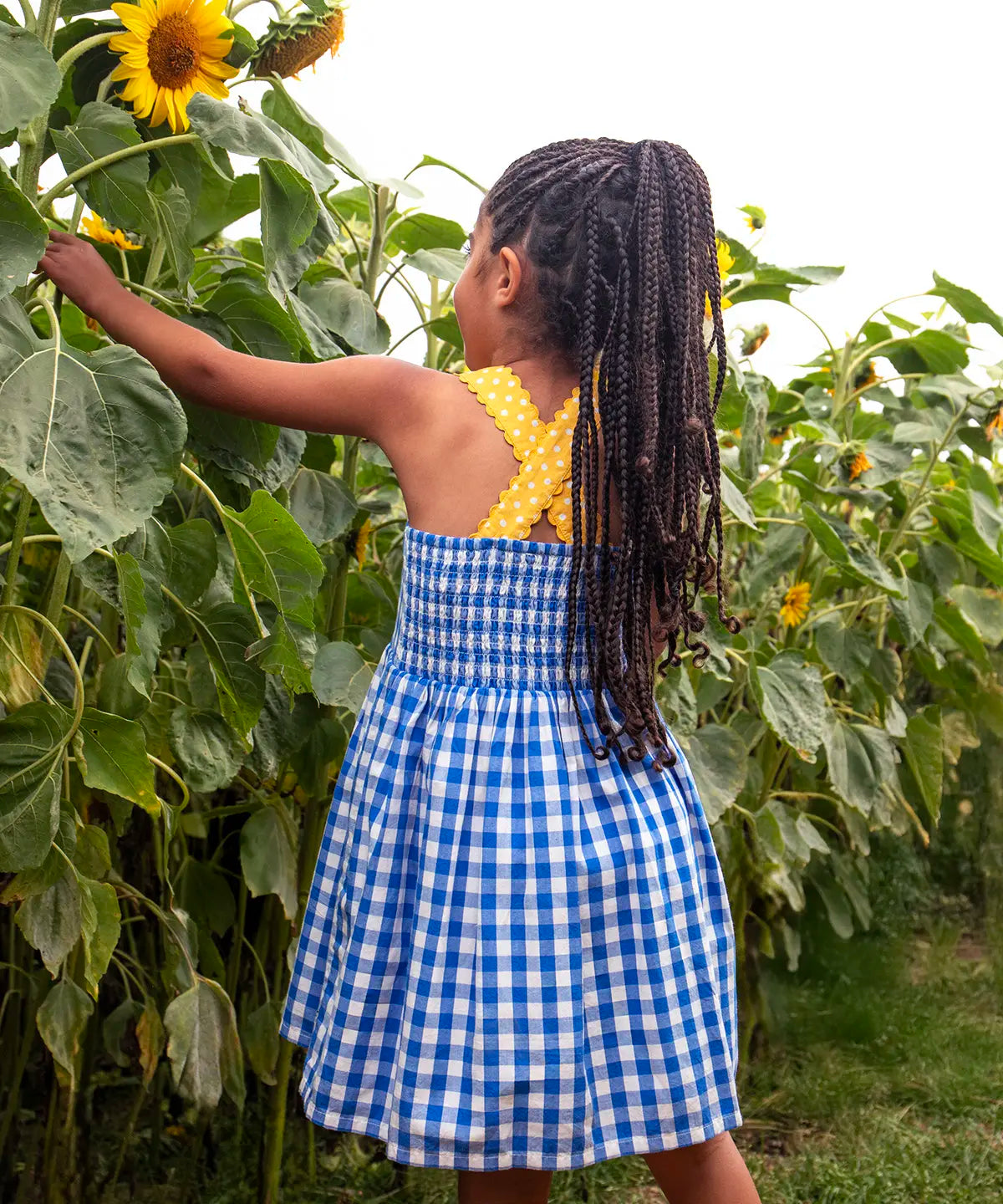 Child wearing Frugi 100% organic cotton dress in blue and white gingham with a large sunflower patch on front in a sunflower field
