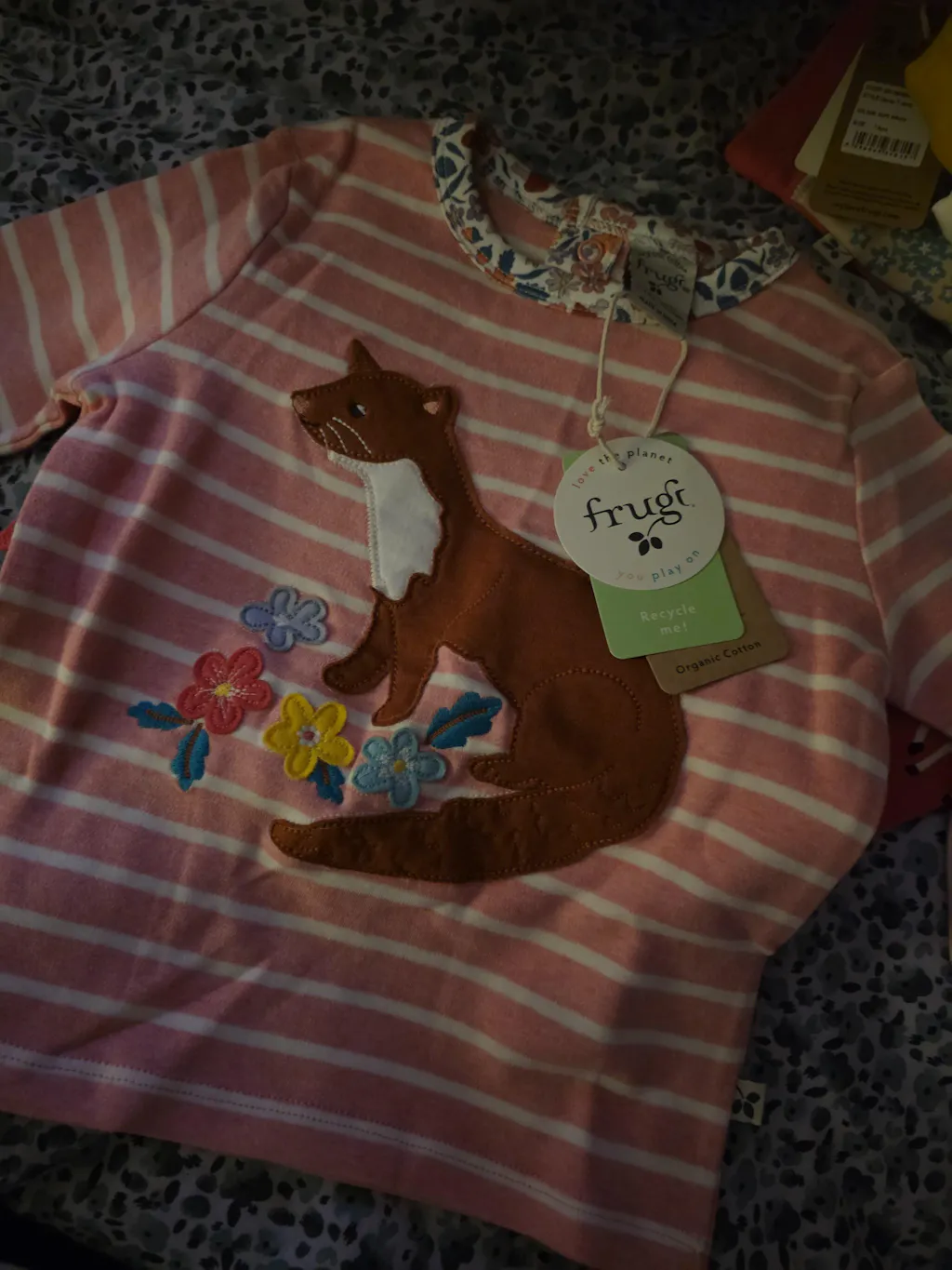Frugi organic cotton archer pine marten applique top pink stripe.
