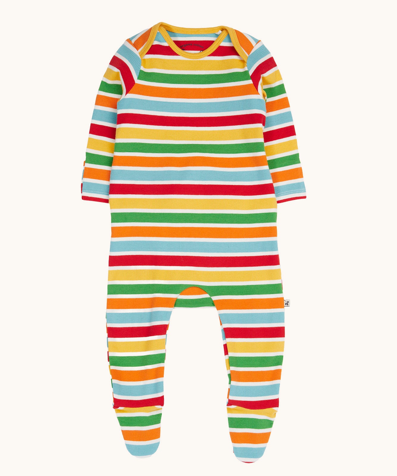 A close view of the front of the Frugi easy dressing rainbow striped ribbed material babygrow. easy access on the back to roll off the legs off for easy nappy changes.