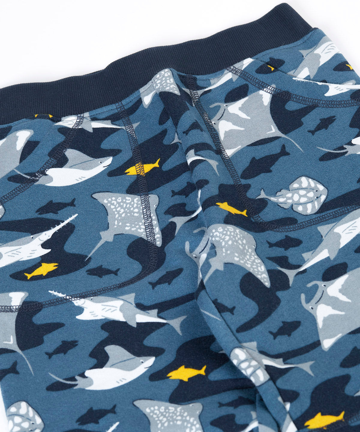 A close up of the frugi joggers laid flat showing repeating grey manta ray print and the navy elasticated waist band