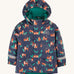 Frugi kids puddle buster coat in be hoppy. A navy waterproof hooded coat with multiple playful prints of frogs on Lilly pads and orange fleece on the inside. Features 2 side pockets, reflective straps on the wrist cuffs and a hook on the inside to hang up