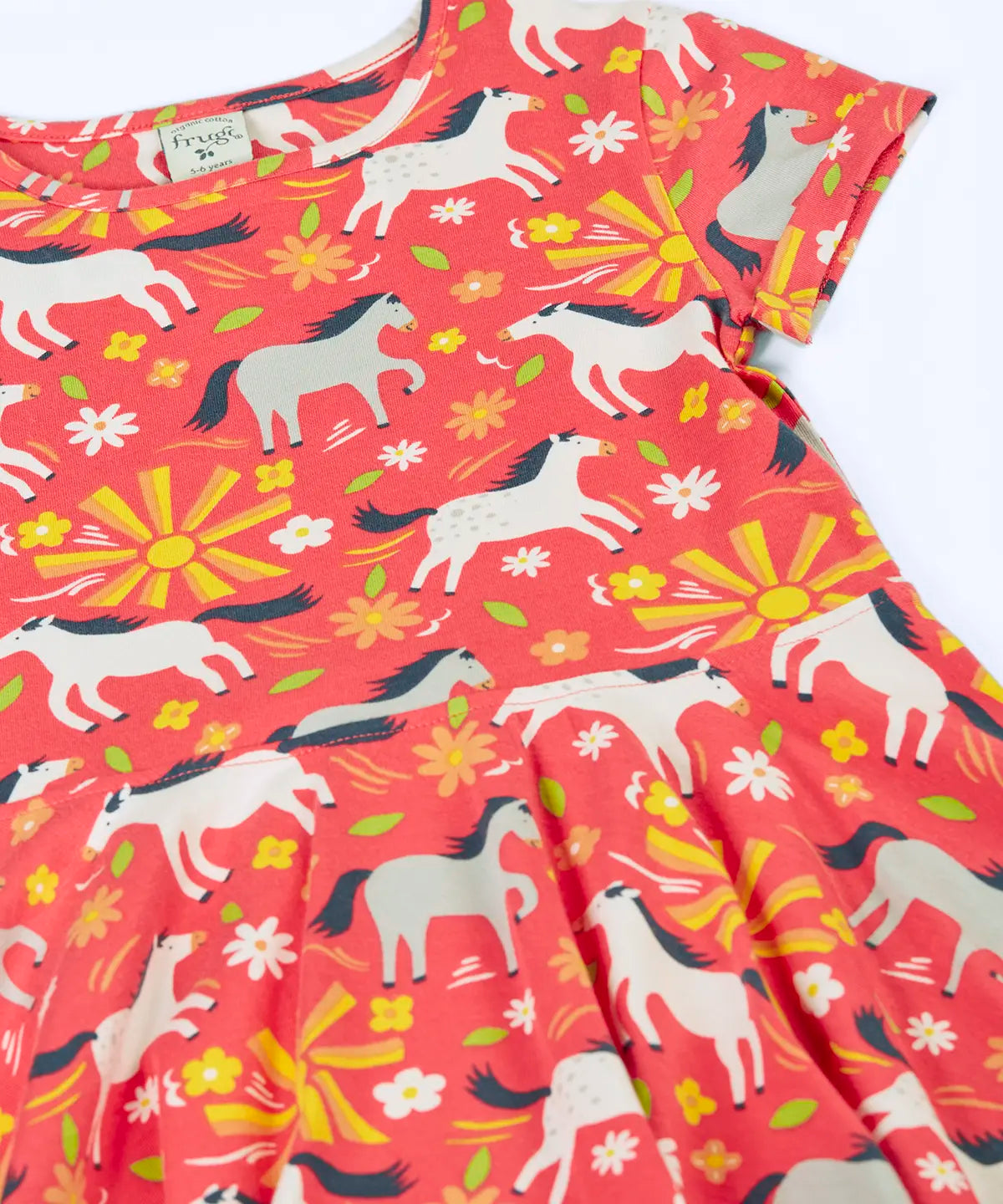Frugi 100% spring skater dress in coral pink with repeating prints of grey and white horses