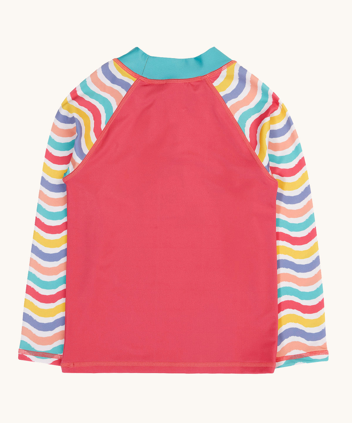 This bright pink swim top features a colourful ice cream cone graphic on the front, with wavy pastel rainbow striped raglan sleeves for a fun, standout look. Explore Frugi UPF 50+ swimwear at Babipur for sunny day essentials made for every splash.