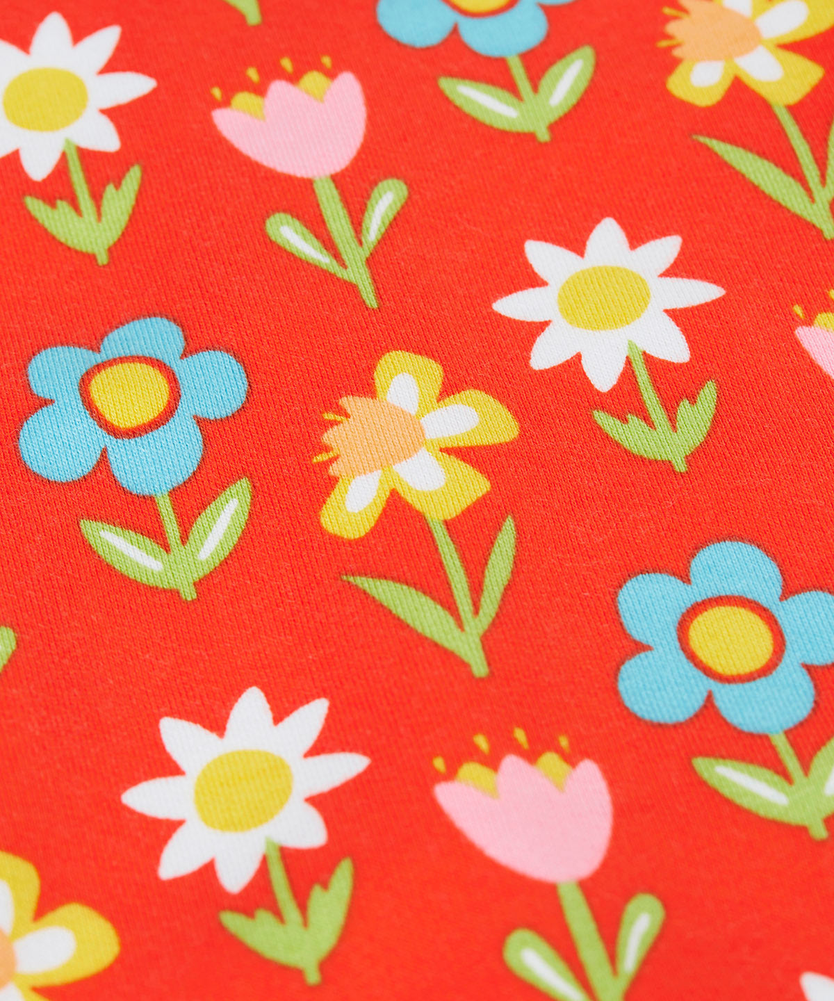 A close up of the repeating pastel flower print ont the frugi red sweatshirt