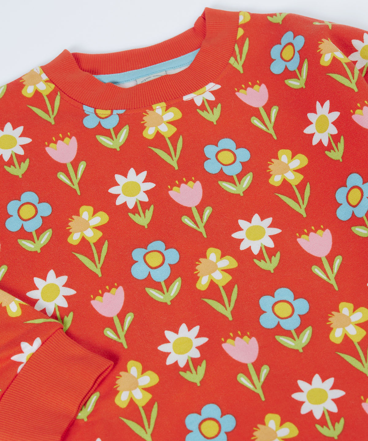 A close up of the Frugi organic cotton sweatshirt laid flat. In red with a repeating flower print
