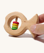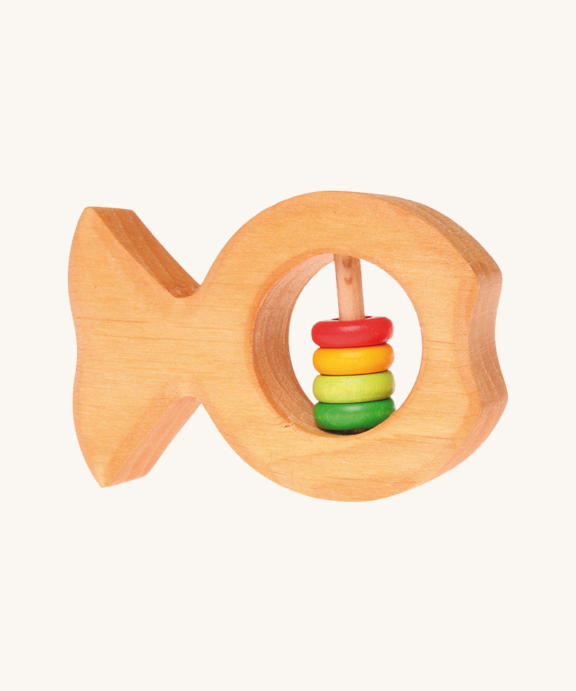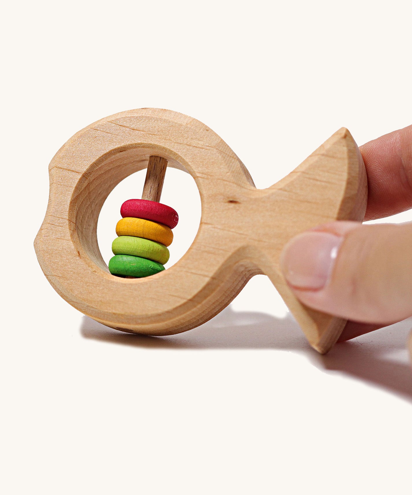 This natural wooden baby rattle in the shape of a fish has a simple design but is absolutely lovely. Babies will love being able to grasp the chunky outline of a fish and spin the four colourful discs. Perfect for rattling and chewing on by teething tots, this wooden baby toy is a perfect new baby gift. Stylish, pared back and ethically made in the Waldorf Steiner tradition, this wooden toy is great for sensory exploration - from the sound of the rattle to the flash of colour and taste of the wood. Made with solid alder wood and treated with a non-toxic, plant-based oil, this baby toy is safe for babies to chew on. Keep it safe by attaching it to a pacifier chain or add to a nursing necklace to keep baby entertained.