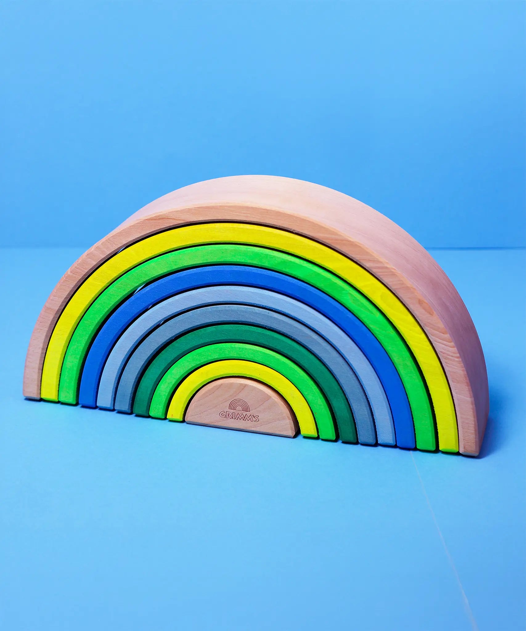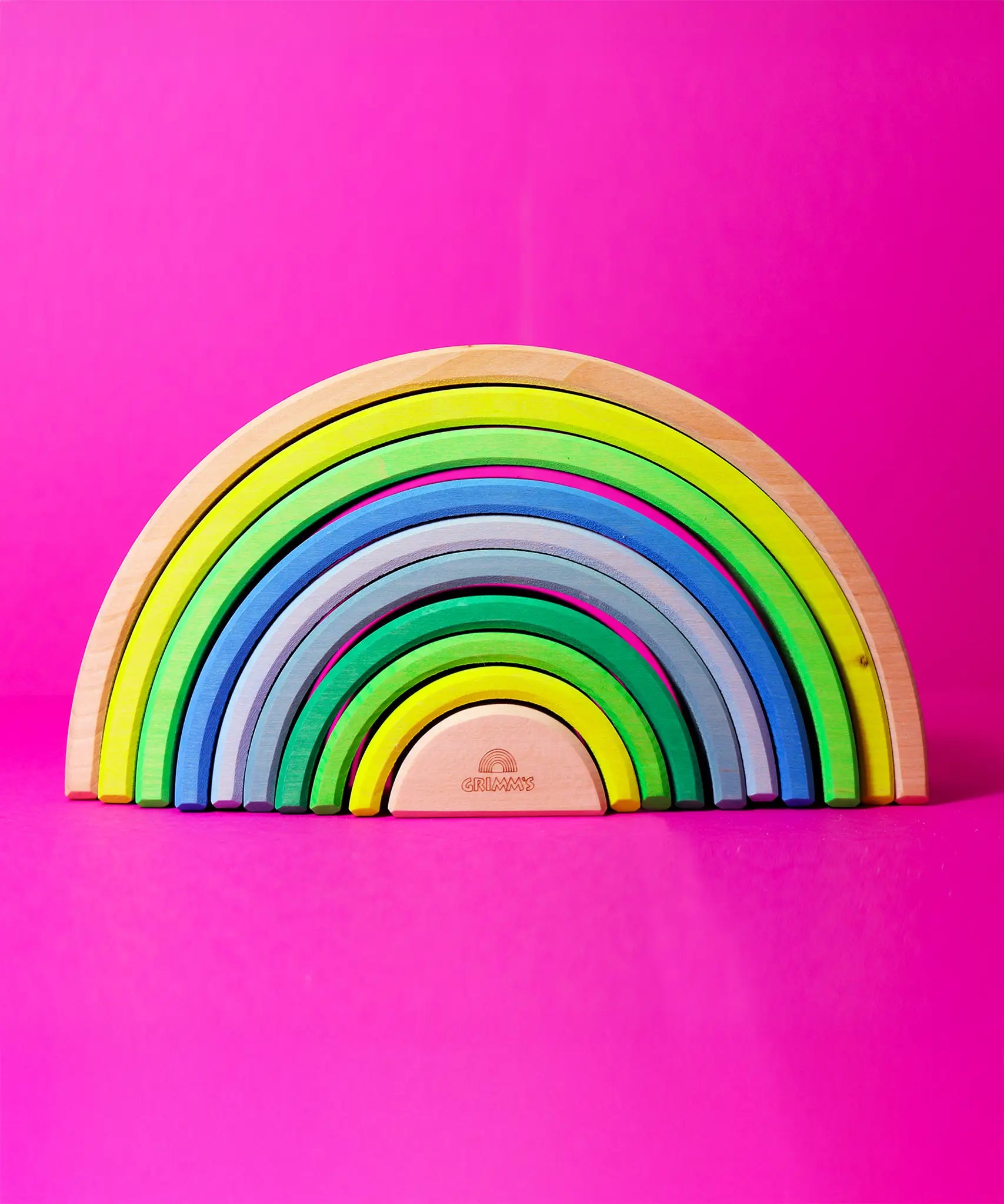 The Grimm’s Neon Green Wooden Rainbow is a beautiful 10 piece wooden stacking rainbow toy for toddlers and children, in bright day-glow colours interspersed with warm natural wood. This arch-shaped rainbow wooden stacking toy by Grimm's is a firm favourite with Babipur customers. With endless opportunities for toddlers to play, from stacking and balancing to making bridges and structures, the Grimm's Rainbow is a truly versatile open-ended toy. Children and adults alike are mesmerised by these beautiful hand crafted sensory toys.