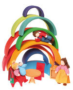 The Grimm's Large Rainbow surrounded by other Grimm's rainbow coloured wooden toys.