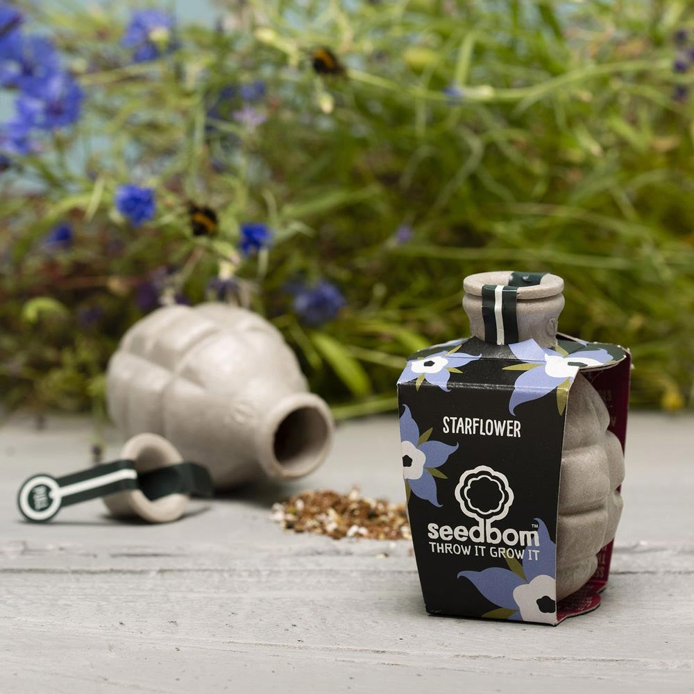 Make flowers not war with a Seedbom - a fun, sustainable alternative gift to a bouquet of intensively grown cut flowers. Children and adults alike will love a Seedbom and giving one to a child is a great way to introducing them to gardening and caring for wildlife. The grenade shell is ethically made with PaperFoam®, a completely renewable, compostable and pollution-free packaging product and filled with GMO-free seeds and peat-free compost. Your Seedbom comes packaged with recyclable glue-free card, made from recycled paper.
