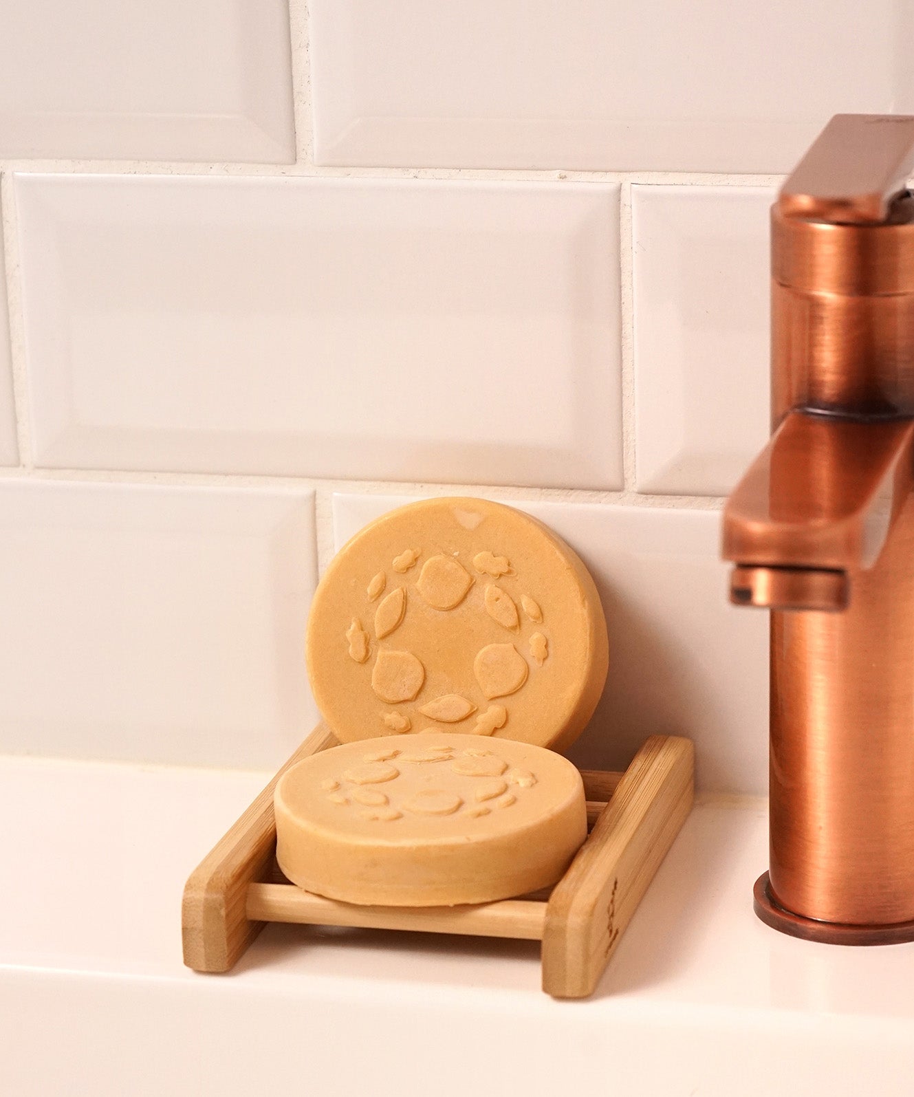 Two Lamazuna shampoo bars resting on a bamboo soap dish by a sink, showcasing zero waste solid haircare with plant-based keratin.