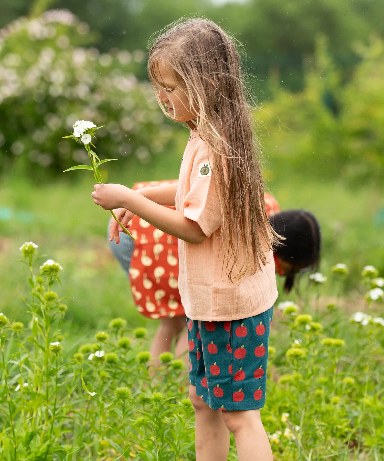 Child wearing the Little Green Radicals kids light coral pink short sleeved henley top with apple patch label on the side of one arms and a button up front with repeat red apple print dark blue shorts.